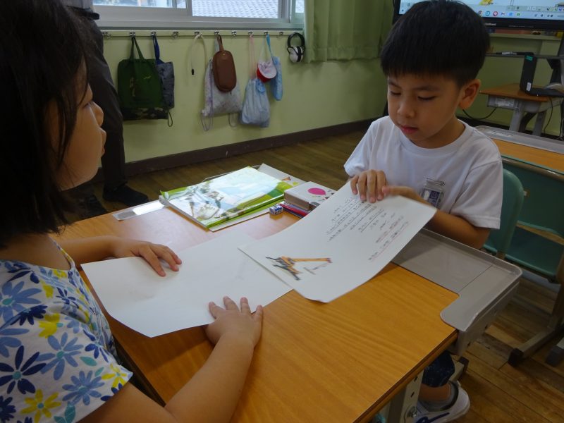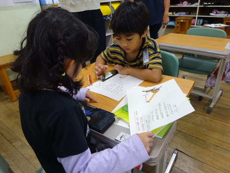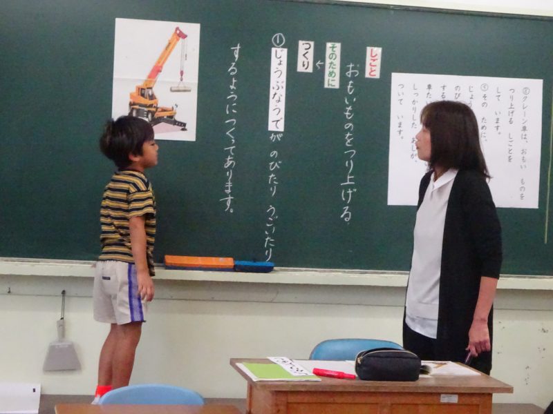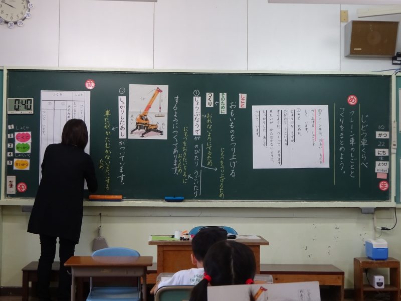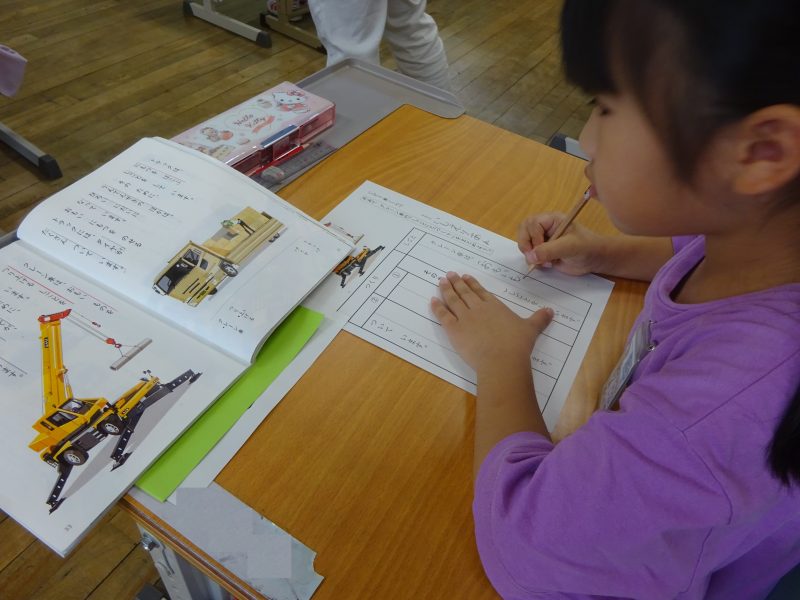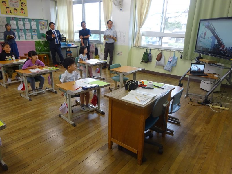今日の朝日小【学校生活】 1年国語 じどう車くらべ 【更新日】2025年10月27日 10月22日(水)、1年生は国語科の研究授業がありました。 たくさんの先生方がやってきて、やや緊張気味の1年生でしたが、定規を使って線を引いたり、ペアで考えを伝え合ったり、考えを発表したりと、とても立派に学習する様子が見られました。 この日はクレーン車の仕事と働きについて、読み取ったことを動作化や動画で確かめました。 このところ、運動場にクレーン車が来ていたので、長い腕や丈夫な脚を間近で見ることもできました。