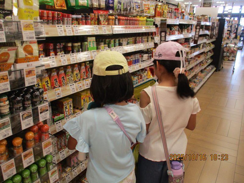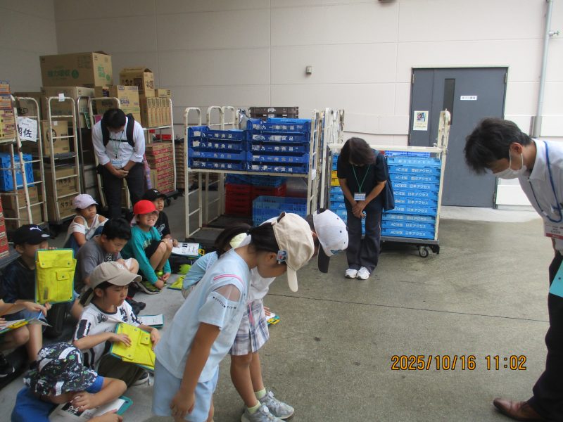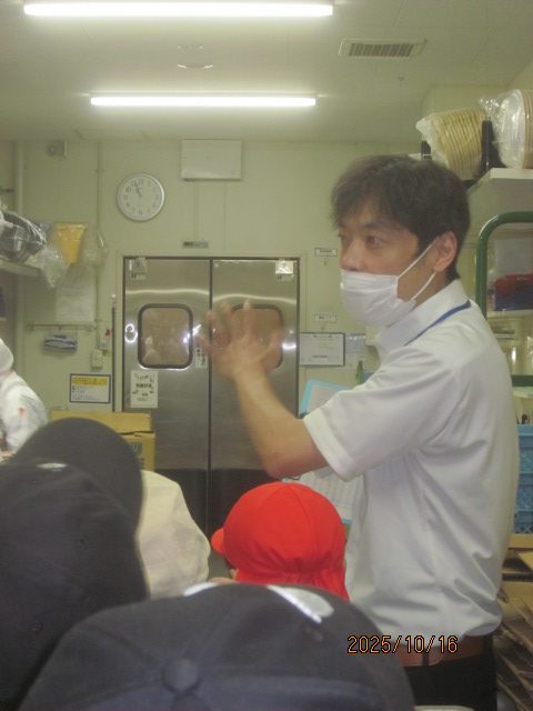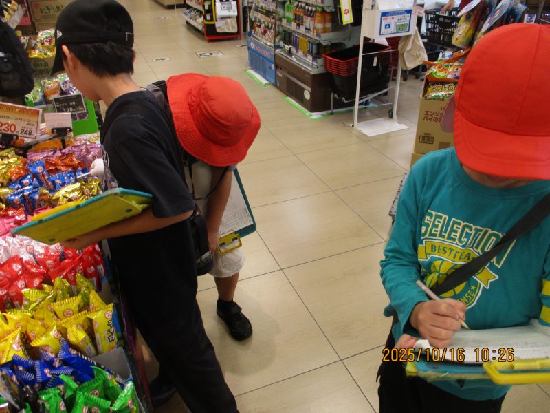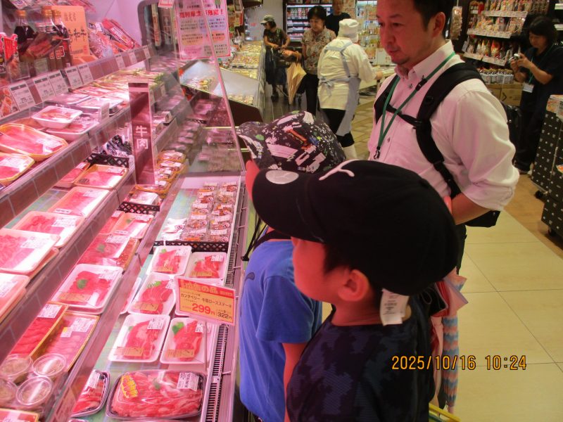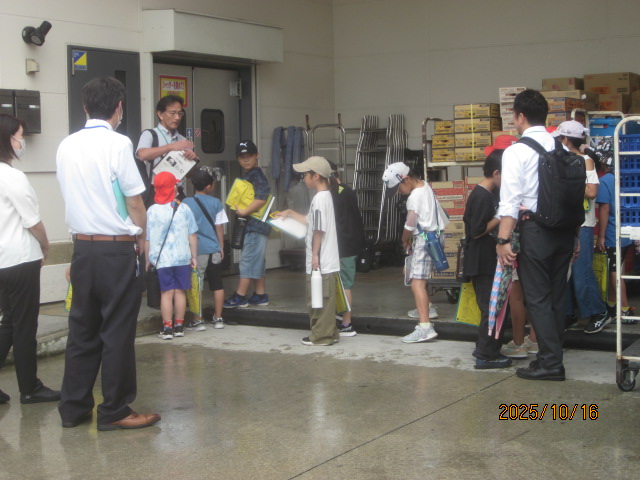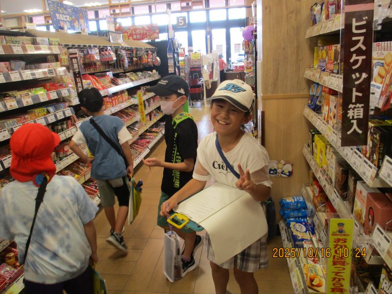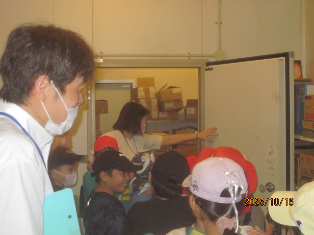 今日の朝日小【学校生活】 3年社会 スーパーマーケット見学 【更新日】2025年10月27日 10月16日(木)、3年生は社会科の学習で、校区内にあるスーパーマーケットに見学に出掛けました。 このお店を利用している家庭が多く、子どもたちも慣れ親しんだところではありますが、お店の方に話を聞いたり、バックヤードを見せていただいたりしたことは新鮮だったようです。 来校後、「大きな冷蔵庫に入ったよ!」と嬉しそうに話していました。