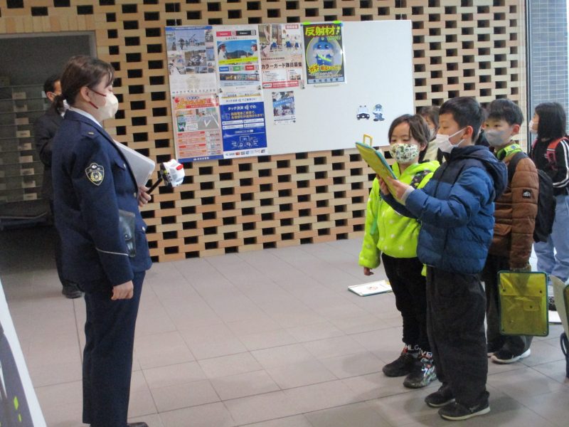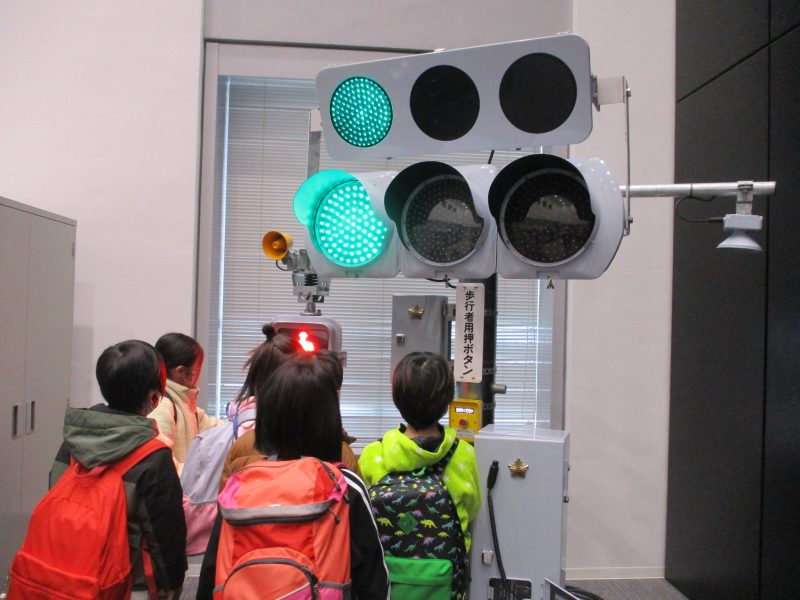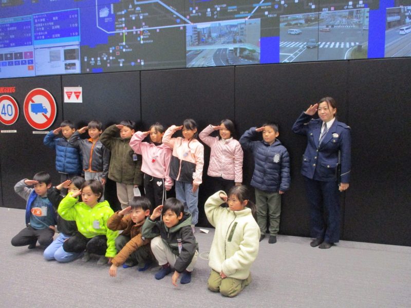 まずは、旭大橋を渡って県警本部に行きました。県警本部では通信指令室と交通管制センターの見学をしました。敬礼が凛々しいですね。