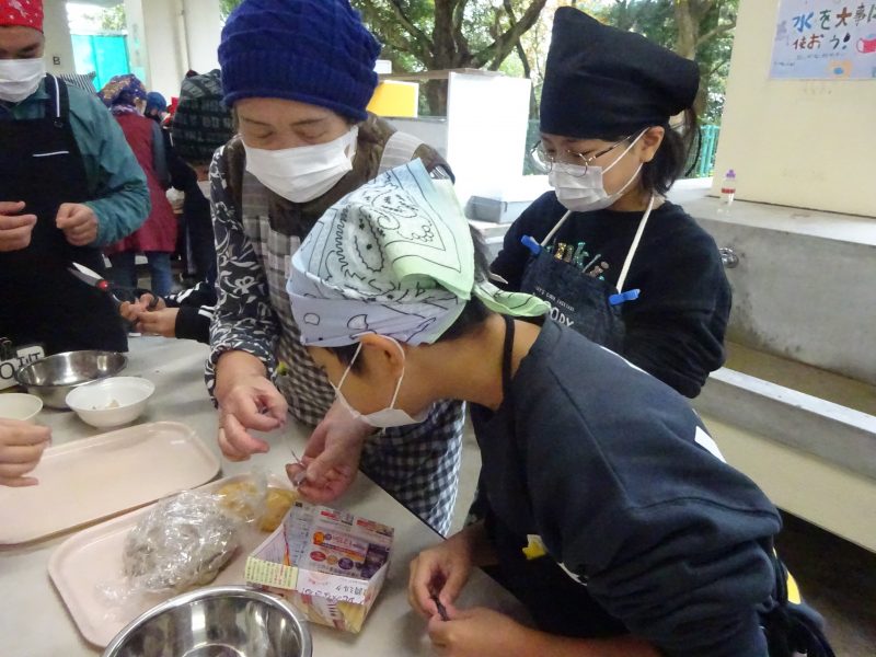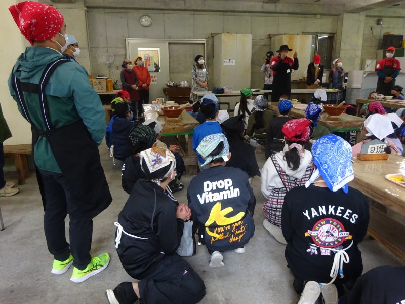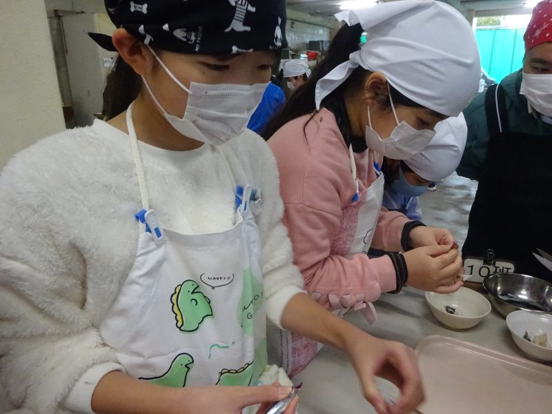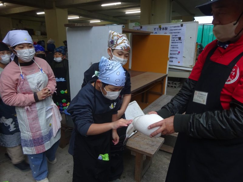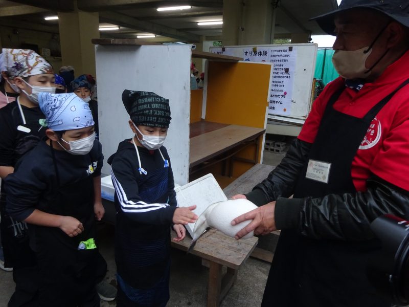 日吉自然の家到着後に、入所式、オリエンテーションを実施し、ひとつ目の活動である「すり身づくり体験」を行いました。