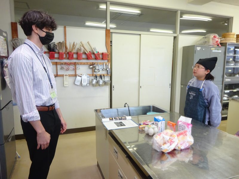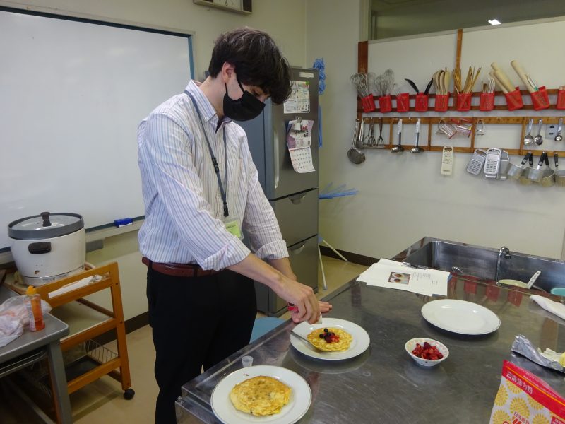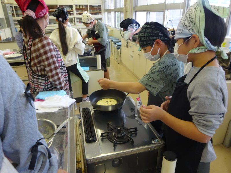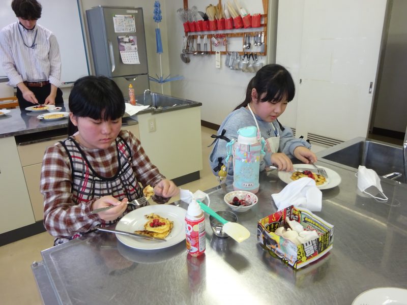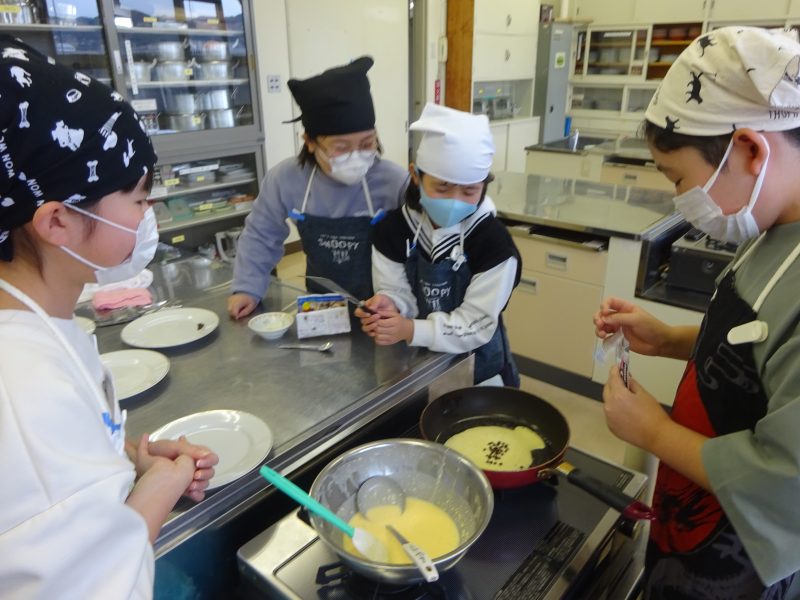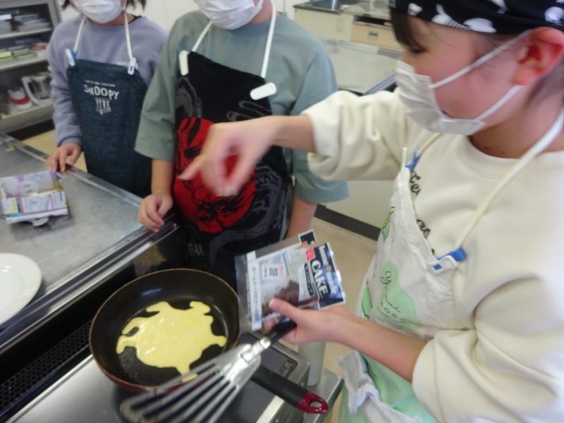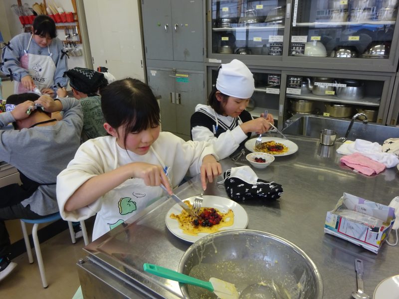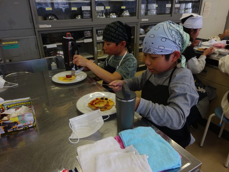今日の朝日小【学校生活】 5年総合 外国文化体験 【更新日】2025年12月10日 12月3日(水)、5年生は外国文化体験として、アメリカからいらっしゃっている先生にチョコチップパンケーキの作り方を教わりました。 小麦粉、ベーキングパウダー、砂糖に、牛乳やバターを加えて混ぜ、フライパンで焼く時に、チョコチップを加えました。 焼きあがったら、ベリー類を乗せ、シロップを掛けました。 外国文化体験ということで、ナイフとフォークで食べました。 私たちにはおやつのように感じますが、アメリカではよく朝食に食べるそうです。 簡単だったので、家でも作れそうです。