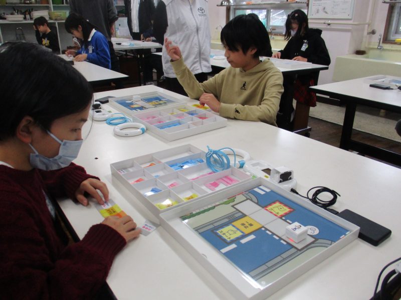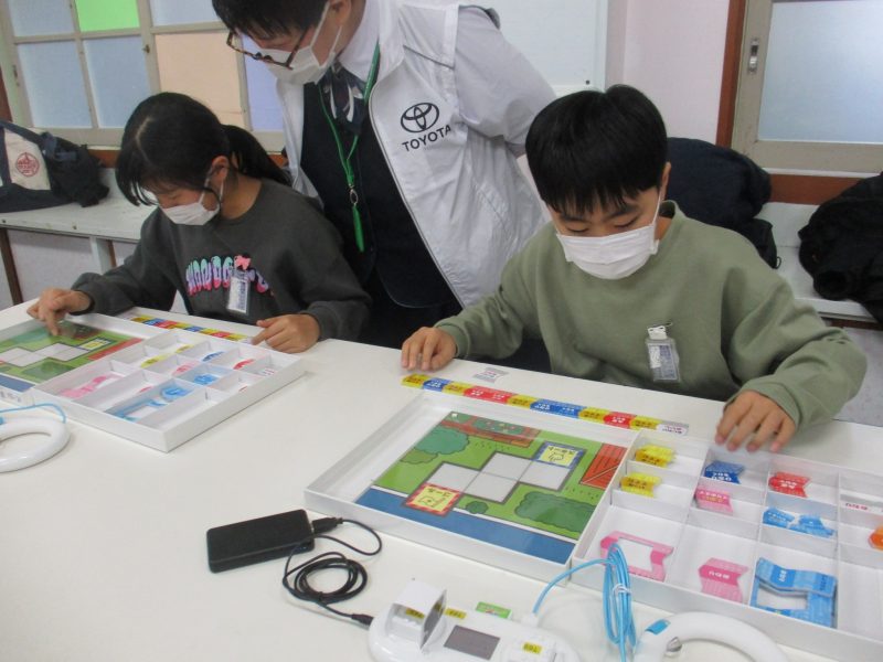 今日の朝日小【学校生活】 6年総合 トヨタ未来スクール 【更新日】2025年12月08日 12月4日(木)、6年生はプログラミングについて学ぶトヨタ未来スクールを実施しました。 パソコンを使わずに、命令カードを並べることで、自動車を動かすプログラムを作成しました。 これらの技術が自動運転の開発につながっているのでしょうね。 このほか、トヨタが取り組む、カーボンニュートラルの取組、プログラミングのように目的を叶えるための技術の力、誰かの困りごとについて思いやり、新しいことを考える想像力の大切さなどについてもお話いただきました。