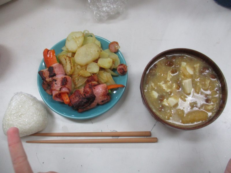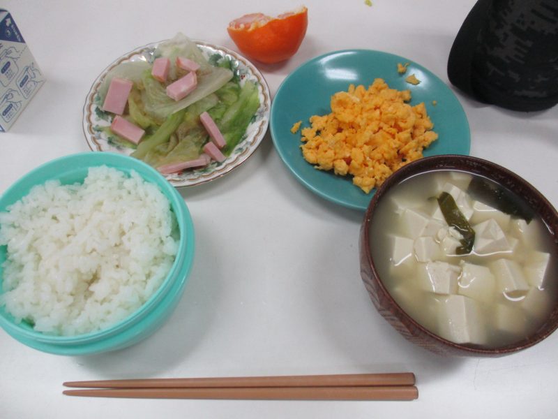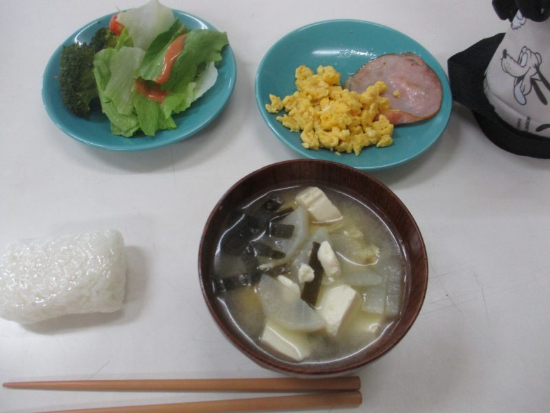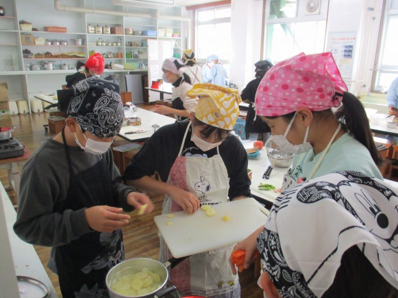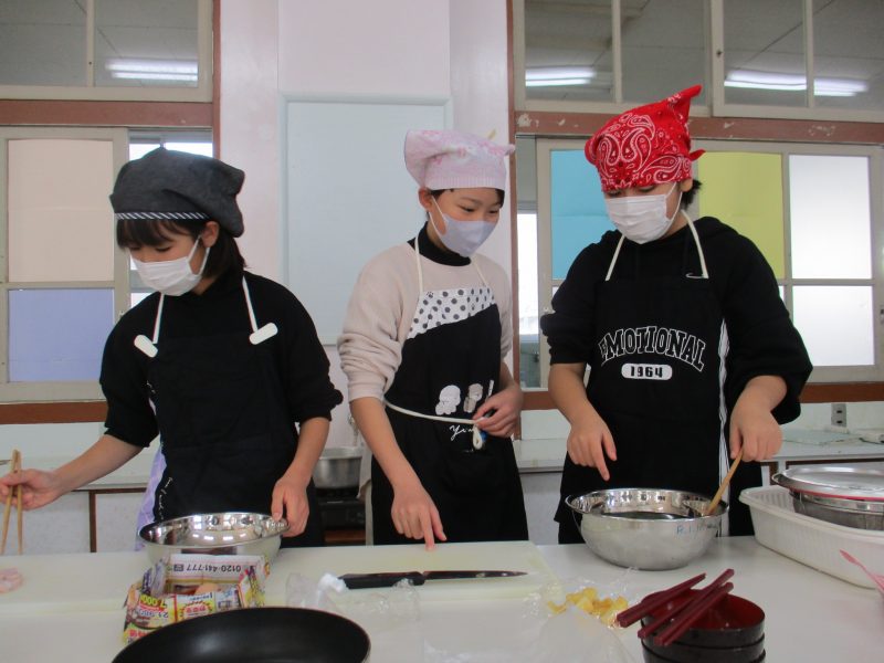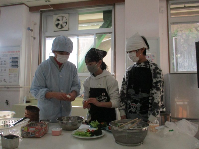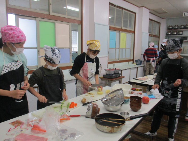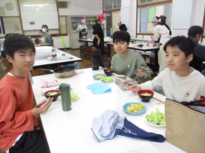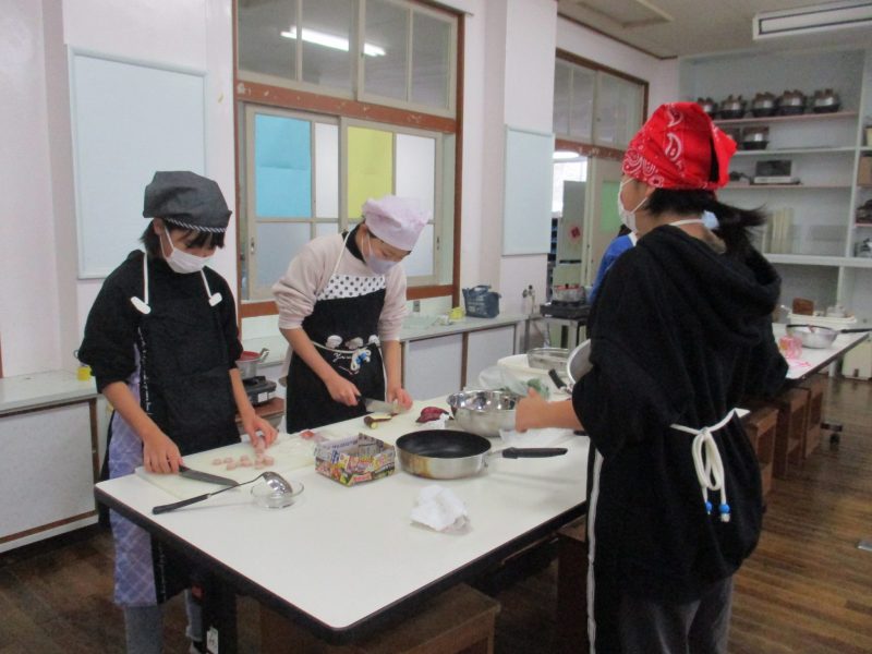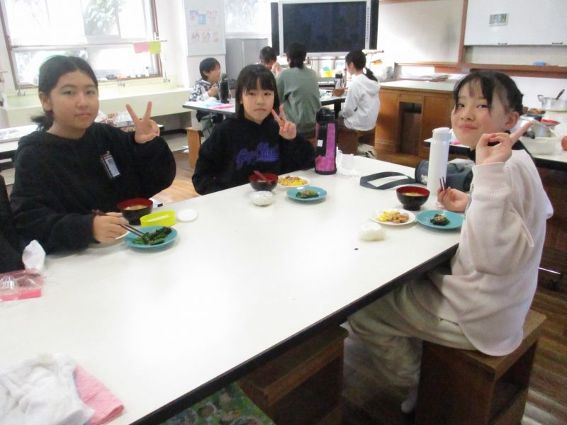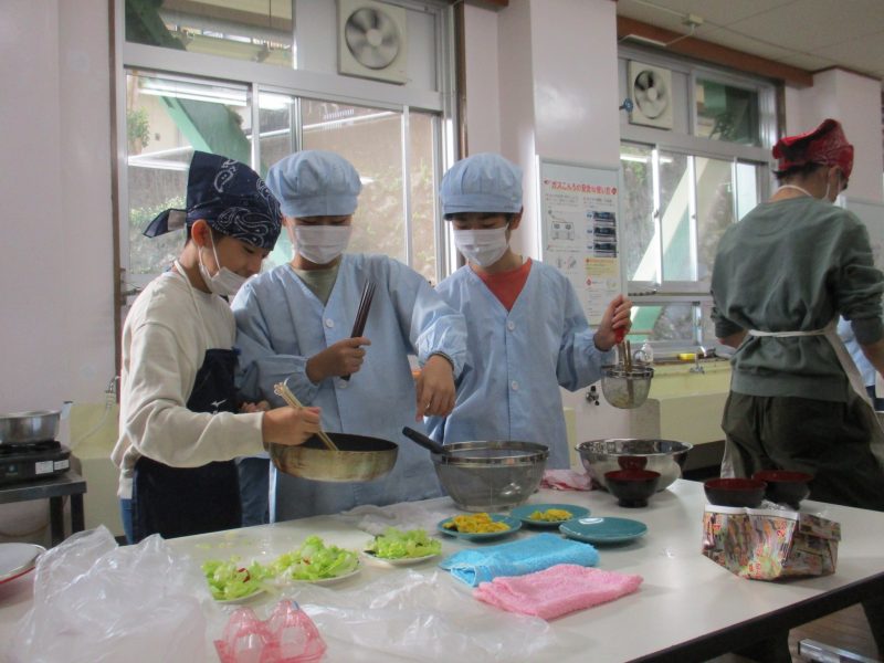 今日の朝日小【学校生活】 6年家庭 こんだてを工夫して 【更新日】2025年12月02日 11月28日(金)、6年生は調理実習でおかず作りをしました。 ごはんとみそ汁に合うおかず(主菜・副菜)を栄養のバランスを考えて1食分の献立として作成し、この日は実際に調理してみました。ごはんは各自持参しました。 小学校の調理実習では、生肉、生魚は使用できませんので、アスパラガスとにんじんのベーコン巻き、ソーセージのピカタ、ハム入りスクランブルエッグ、ほうれん草のおひたし、野菜サラダなど、子どもたちなりに工夫し、友達と協力して作ることができました。