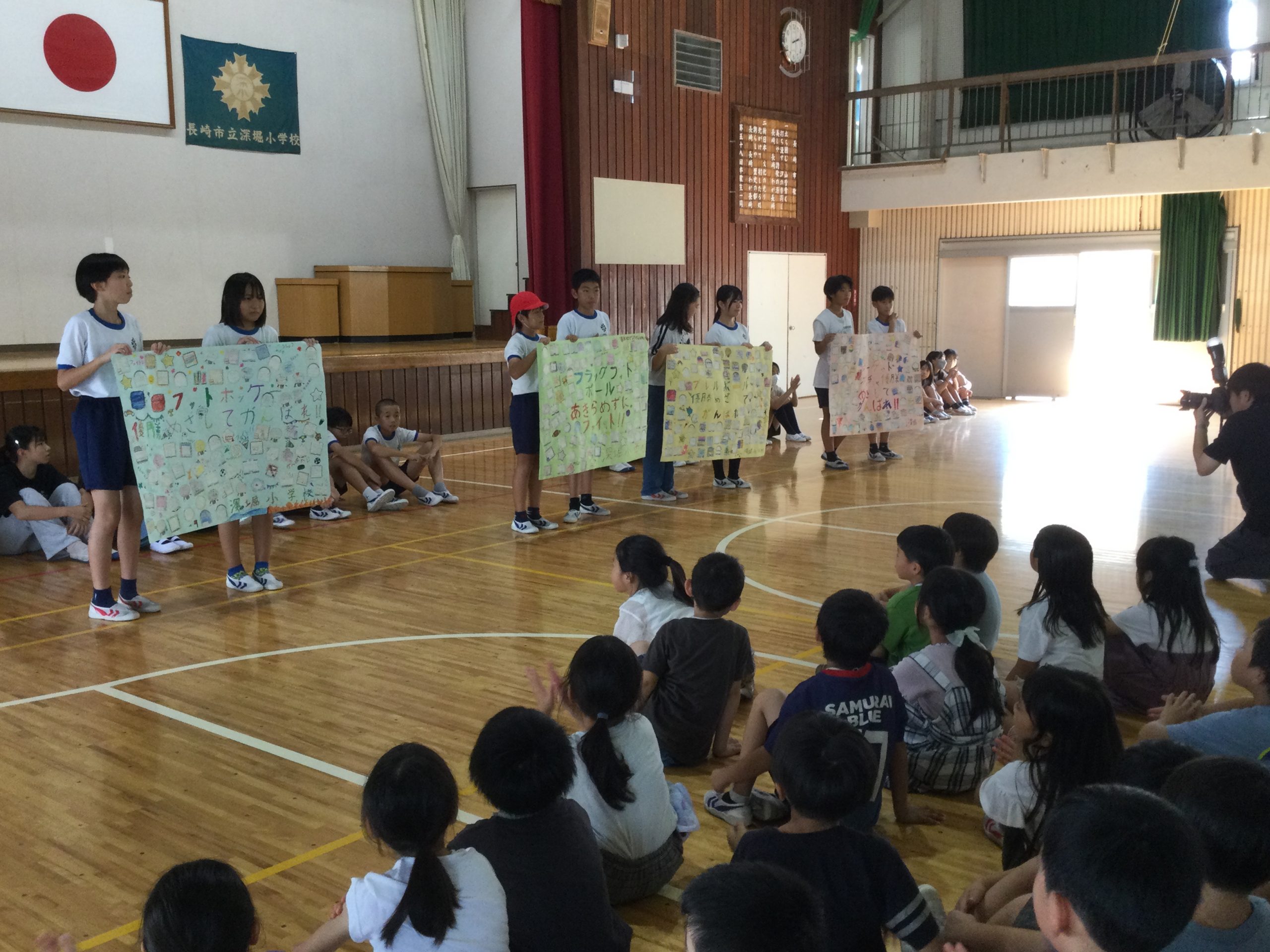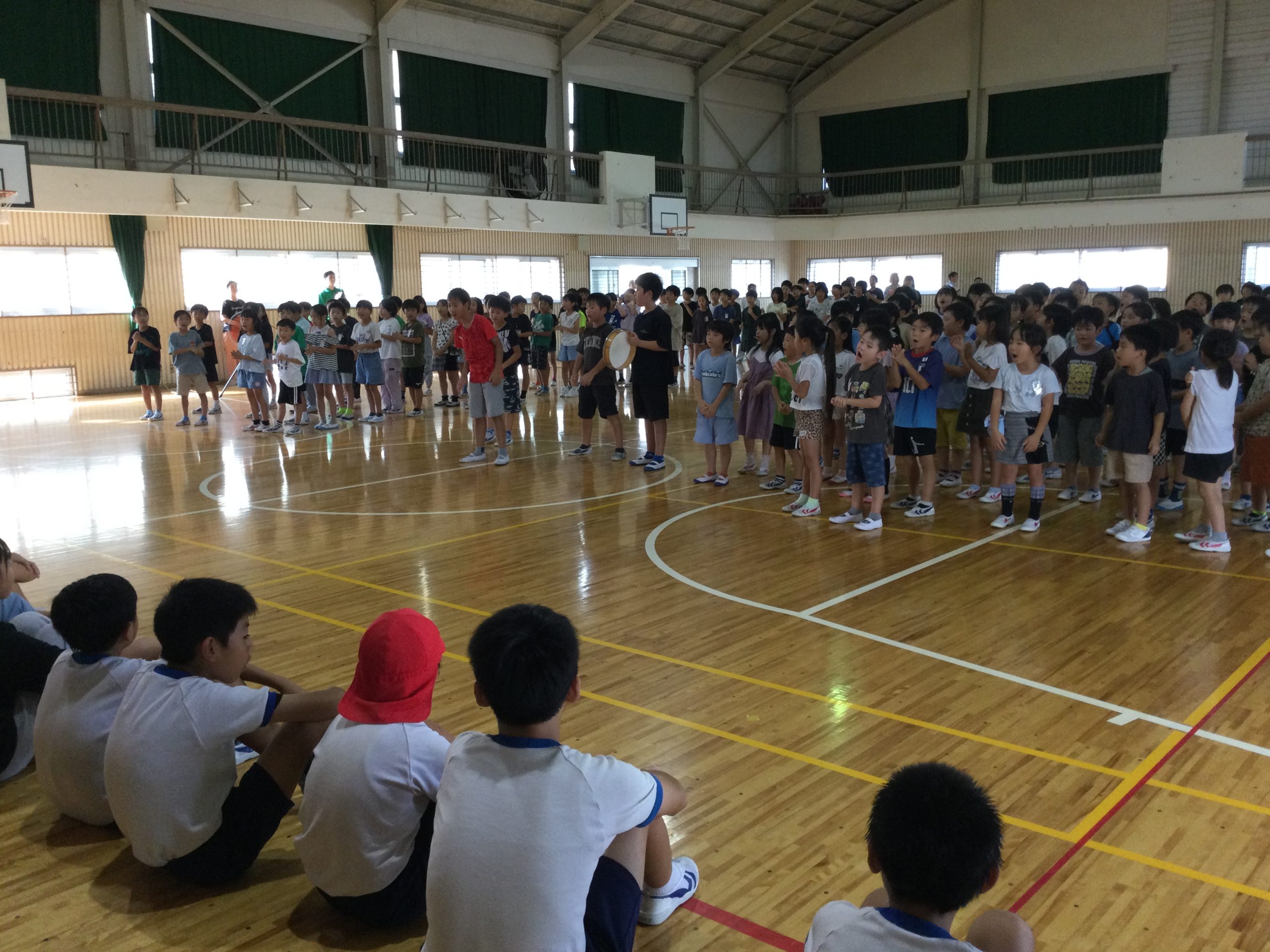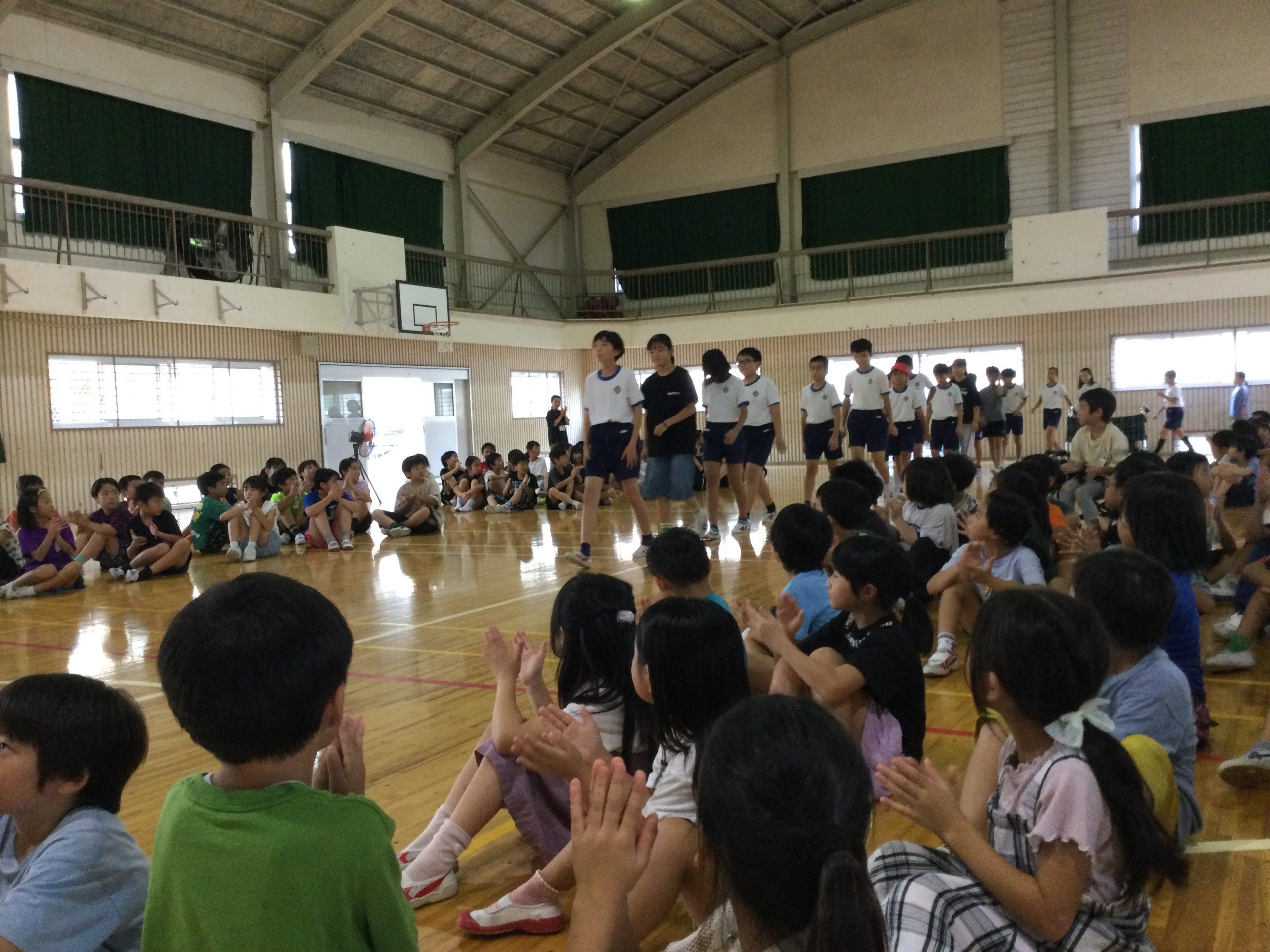 5年生が先頭に立って、小体会に出場する6年生を応援する応援集会を行いました。