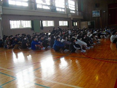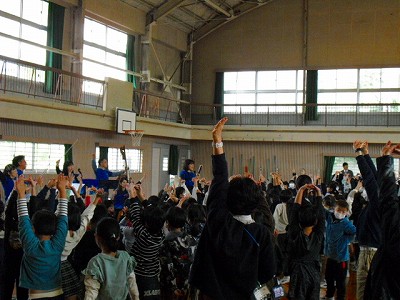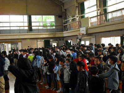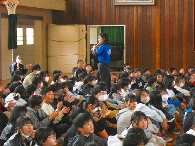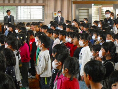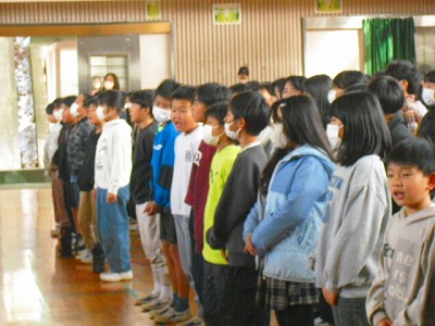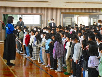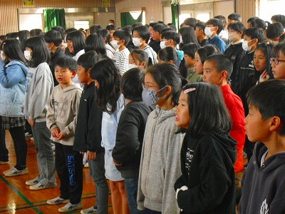 福田小学校の校歌を合奏曲にアレンジして演奏してくださり、それに合わせて斉唱もしました。