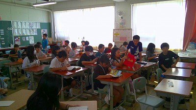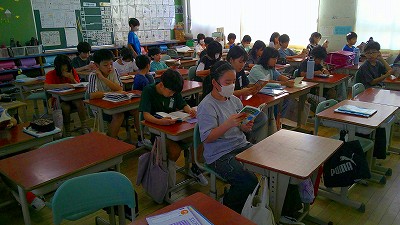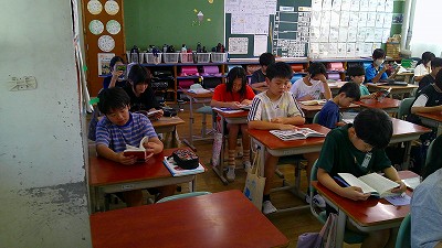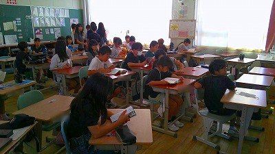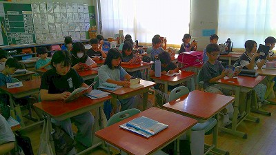 全般【学校生活】 朝の時間 【更新日】2025年10月06日 2学期より、8時5分から8時15分までの時間帯では、特段仕事等がない場合は「読書をして過ごす」ようにしています。本にふれる機会や時間を増やし、心が落ち着いた状態で始業するためです。 もちろん用事がある場合はそれを優先します。5年生は、今週金曜日の「小体会、交流会出場選手を励ます会」での応援のために、リーダーたちはその練習をしていました。