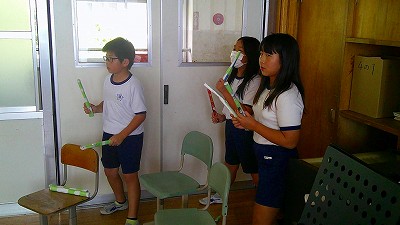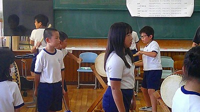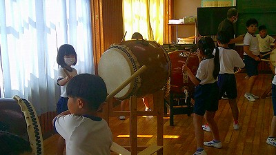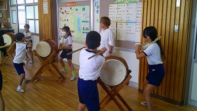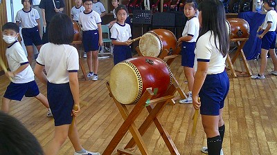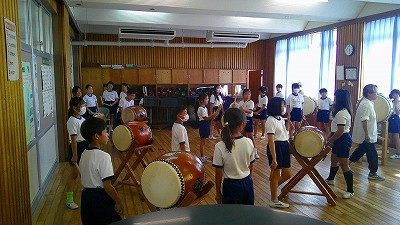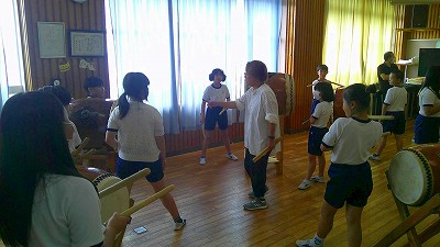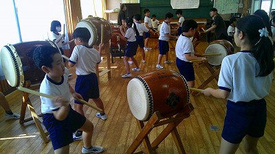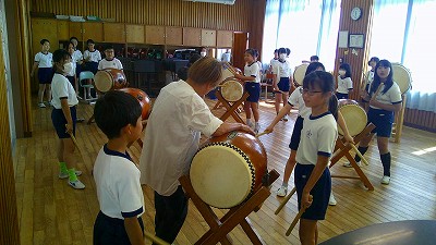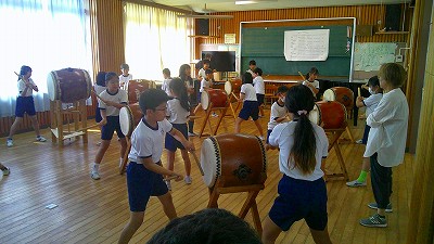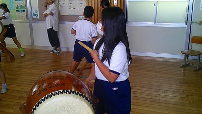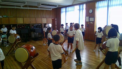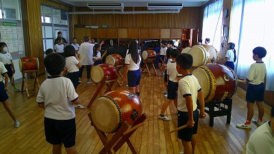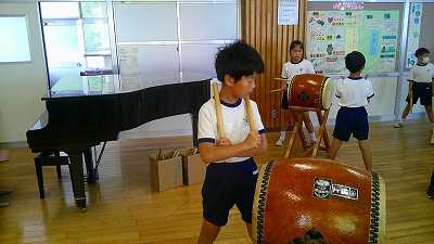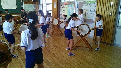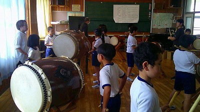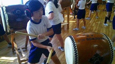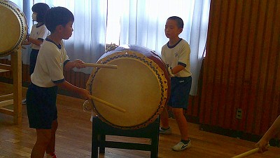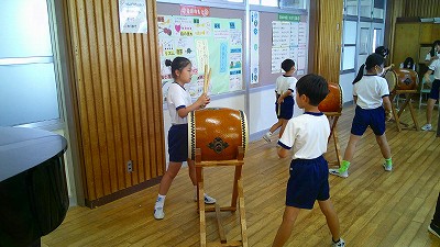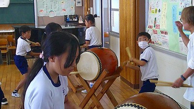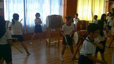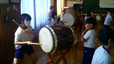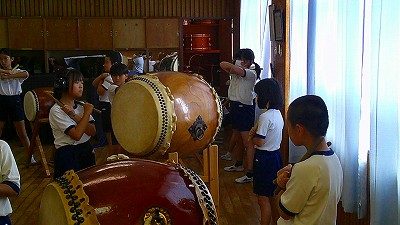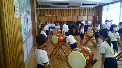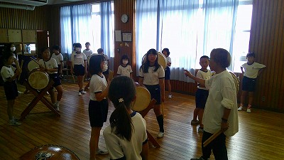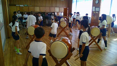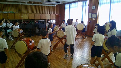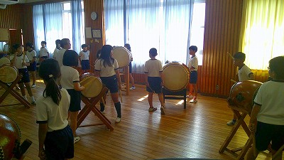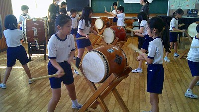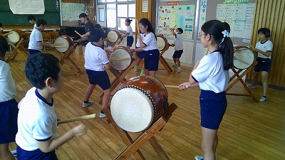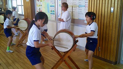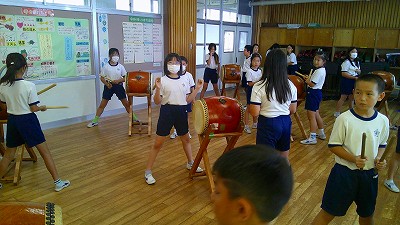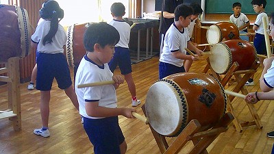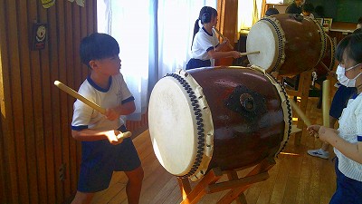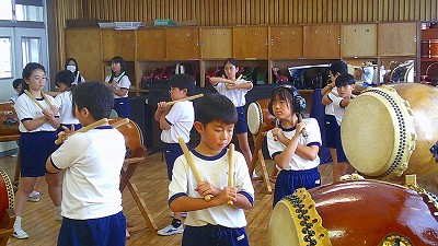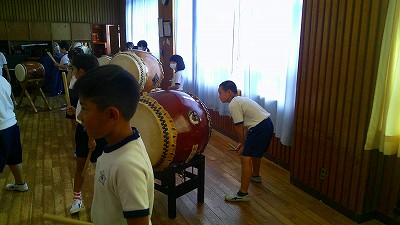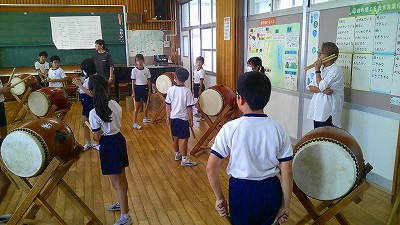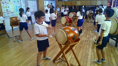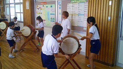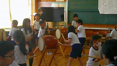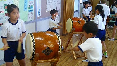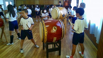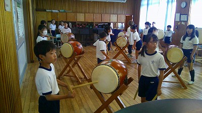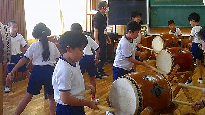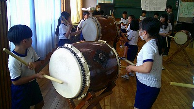 4年生【学校生活】 総合的な学習の時間(4年1組 幟龍陣太鼓の練習) 【更新日】2025年10月08日 練習は3回目となりました。曲の頭から徐々に叩ける部分が増えています。 指導者小森さんと何回も口に出しながらリズムを覚えることを繰り返しています。