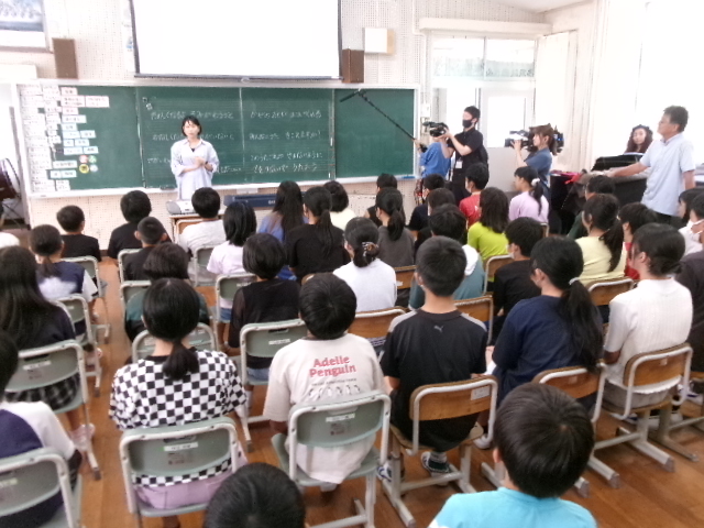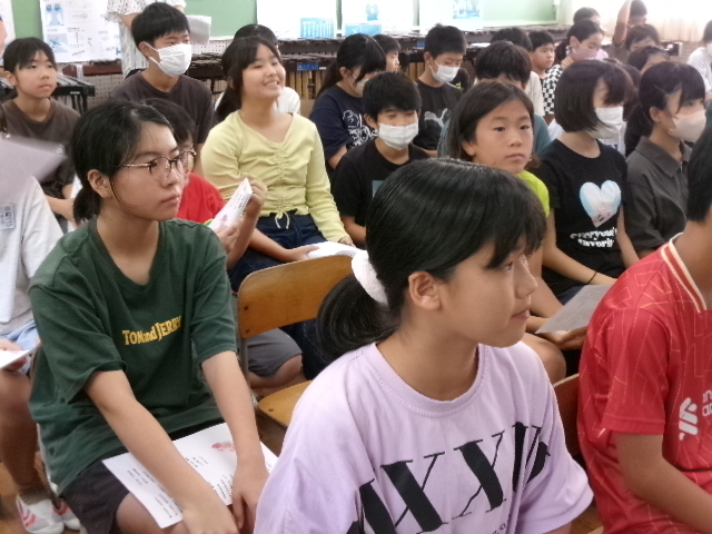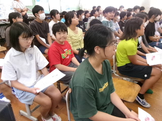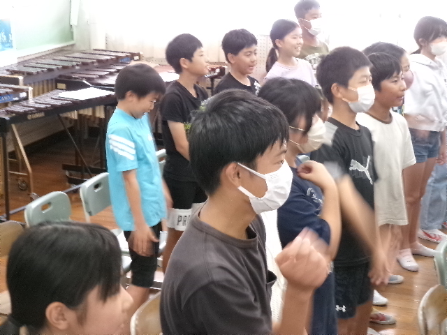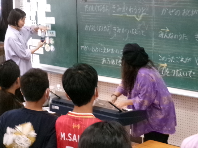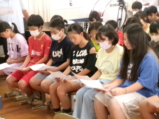6年生【学校生活】 へいわのうたプロジェクト その2 【更新日】2025年09月30日 9月19日に、本校卒業生のKOZUEさんが、第一案が完成した「へいわのうた」を、披露するために来校されました。 Kozueさんは、子どもたちの思いを受け止め、詩を作りメロディーを乗せていただき、素晴らしい曲になっていました。 今回は、子どもたちが歌いやすいか、言葉の意味が理解できるか等、確認していただきました。 10月には、完成します。子どもたちも大変喜んでいました。完成がすごく楽しみです。
