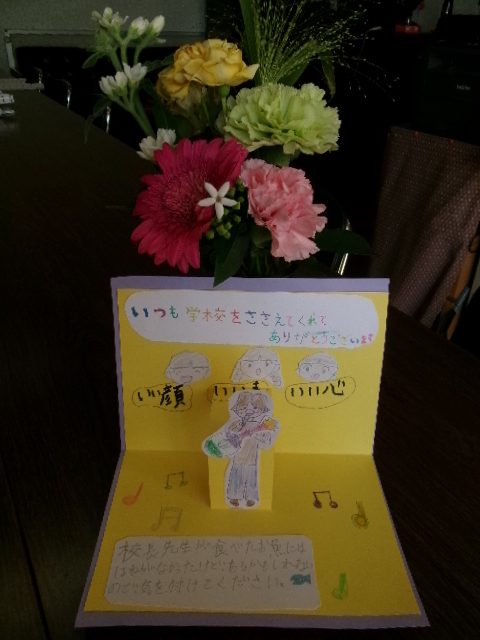 ☆校長diary☆【学校生活】 校長diary うれしいプレゼント 【更新日】2025年12月11日 昨日、4年生の子どもたちから、心温まる贈り物をいただきました。 図画工作科の時間に、「飛び出すカード」を作ったそうです。 その際、私のことを思い出したそうで、学校教育目標や給食時に放送する言葉をカードに入れてくれました。 私は、給食にお魚料理が出た日、「私が食べたお魚には、骨がありませんでした。もしかしたら骨があるかもしれないので、気を付けてください。」と、校内放送を入れることにしています。 4年生、ありがとう。