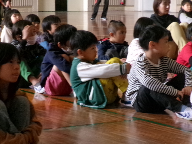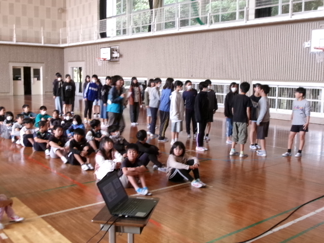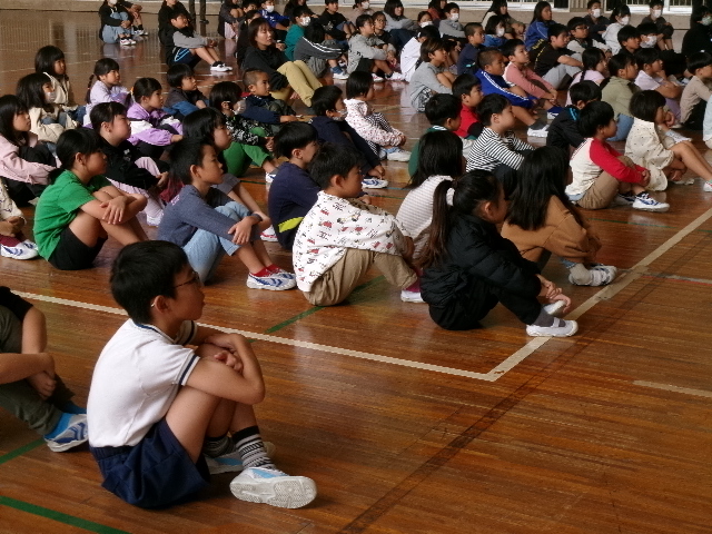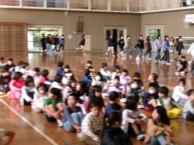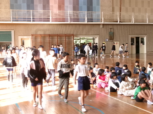 子どもたちは、しっかり放送を聞き、担任の先生の指示に従って行動していました。写真は、体育館に避難する様子です。