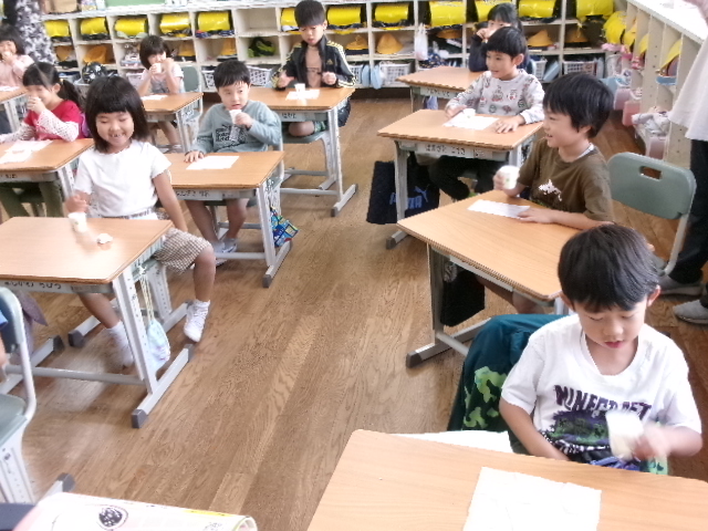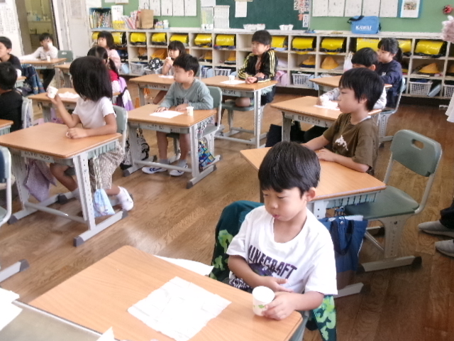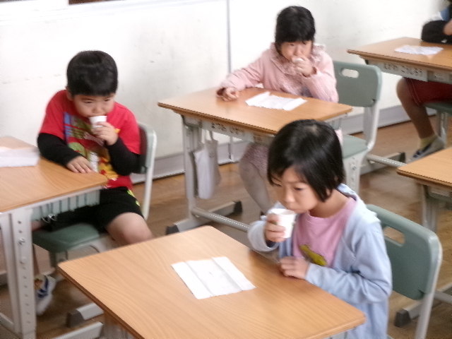 1ねんせい【学校生活】 10月27日の1年生です。 【更新日】2025年10月27日 今朝は、ぶく・ブックタイムでした。1年生は、今日から本物のフッ素を使ってのうがいを行いました。 紙コップに用意されたフッ素液のにおいに、まず反応していました。 「歯磨き粉みたい。」その通りです。歯磨き粉の中に入っています。 子どもたちは、これまで水を使って練習を重ねてきているので、慌てることなく上手にブクブクうがいをすることができました。 自分の歯を大事にして、食欲の秋を満喫し、心も身体も大きなってほしいと願っています。