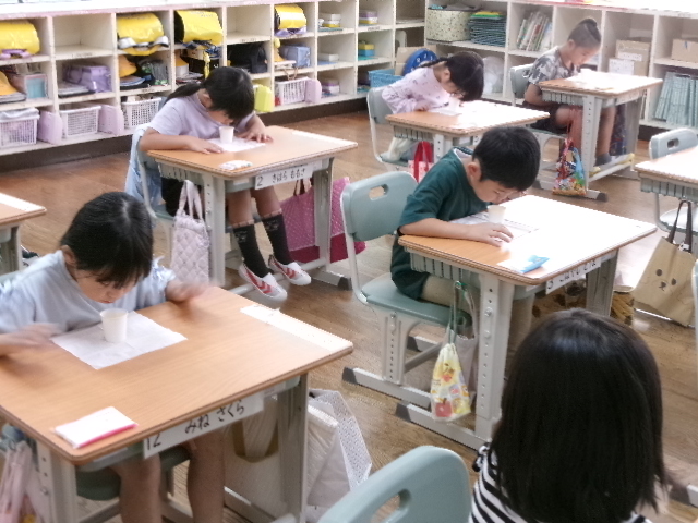 1ねんせい【学校生活】 10月28日の1年生です。 【更新日】2024年10月28日 今朝は、ぶくぶくうがいの日でした。 学校では、フッ化物洗口を行っています。1年生はまだ練習段階です。 今日は、水で上手にうがいをしていました。 音楽の時間には、校歌を元気いっぱい歌っていました。
