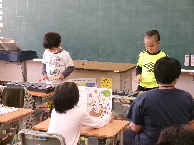 1ねんせい【学校生活】 12月8日の1年生です。 【更新日】2025年12月08日 今日は、音楽家の時間を見に行きました。 子どもたちは、グロッケンの美しい音色を響かせていました。 教室の窓から見えるイチョウの葉っぱが、緑色から黄色へ変わっています。 教室まで明るくなっています。