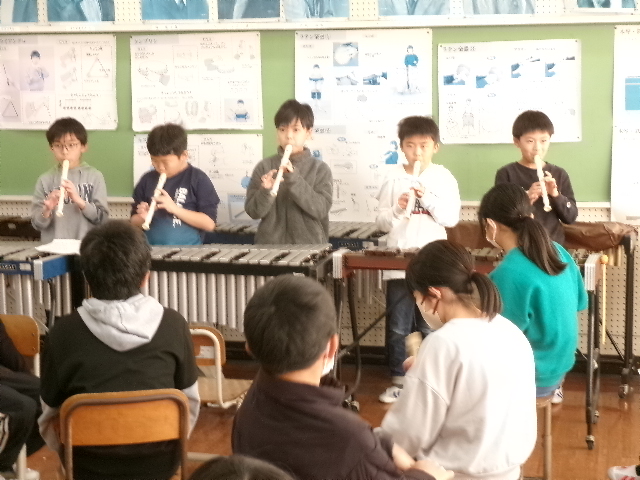 4年生【学校生活】 4年生 音楽科 【更新日】2025年01月22日 4年生は、「茶色の小びん」の合奏に取り組んでいます。 楽器は5種類。リコーダー、鍵盤ハーモニカ、鉄筋、木琴、低音楽器。 まずは、楽譜を暗記することから始めます。演奏する楽器によって、楽譜が違います。 子どもたちは、 小音会で演奏経験があるので、すぐにできるようになると思います。 今日は、立候補した子どもたちが、リコーダーを演奏しました。 頑張っています。4年生。