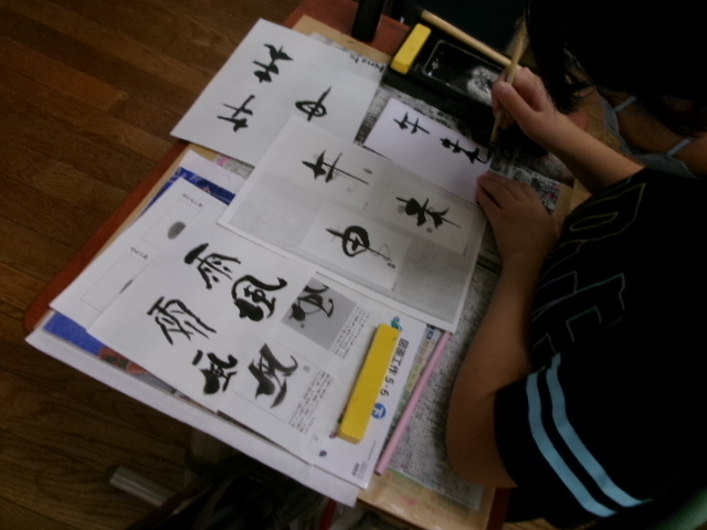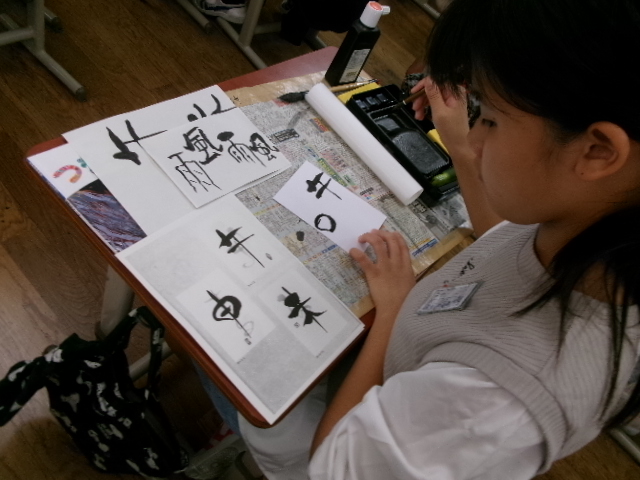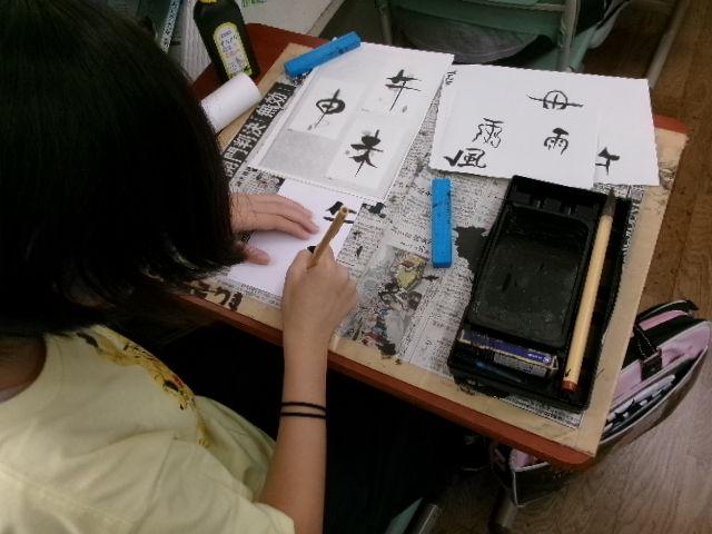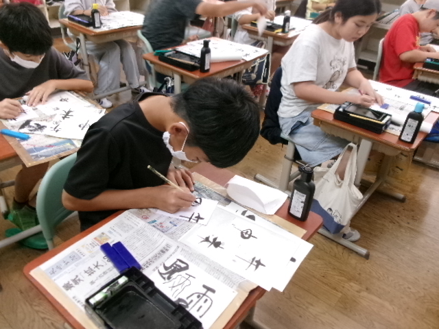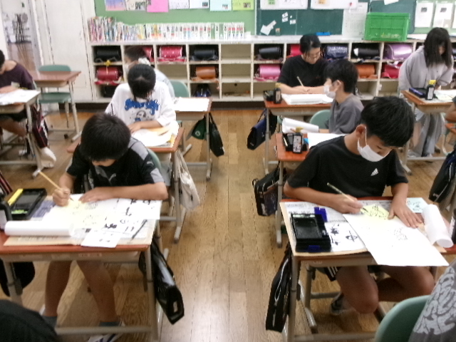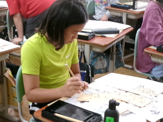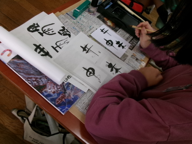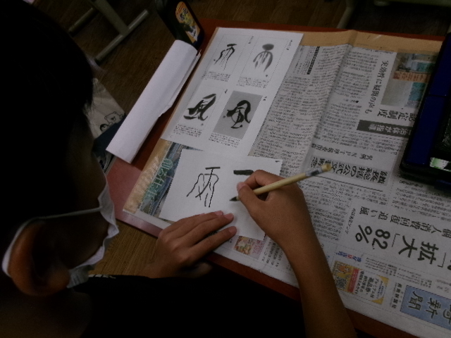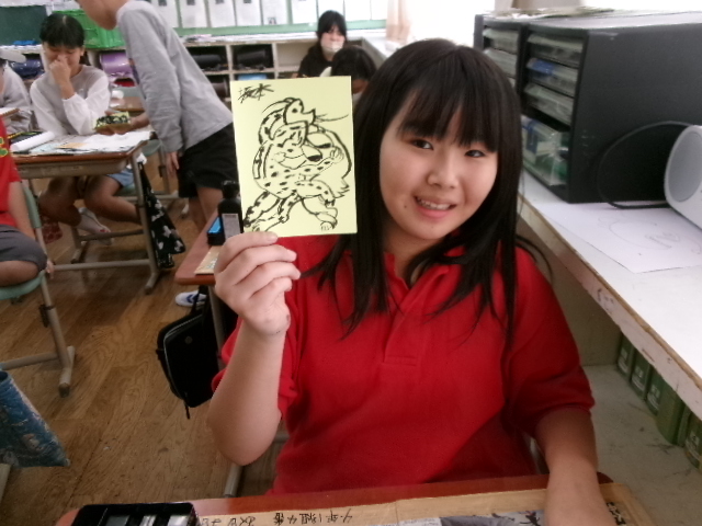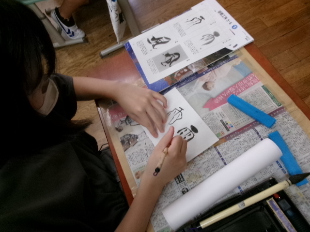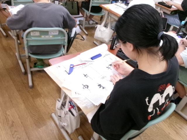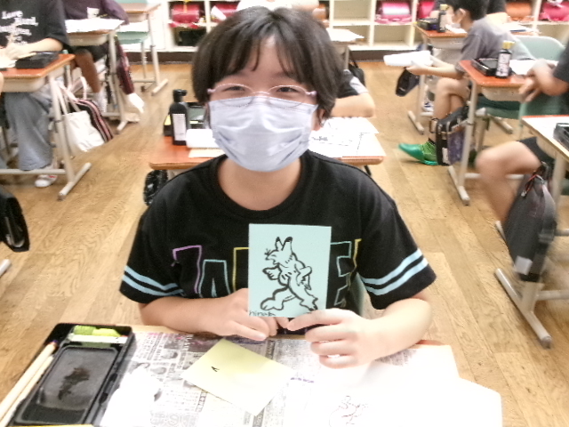 習字で使う墨液で絵を描きました。絵ですから塗りつぶすことができます。また二度書きもできます。子どもたちは、初めは戸惑っていましたが、段々慣れてくると、もち前の集中力で素敵な作品を仕上げました。