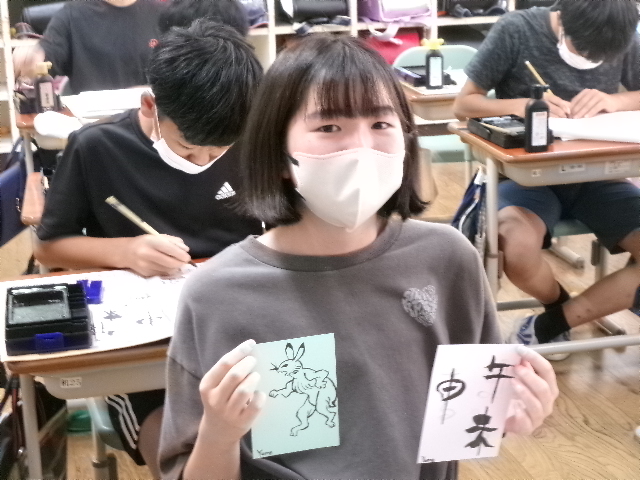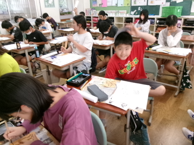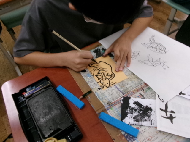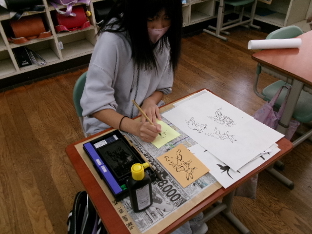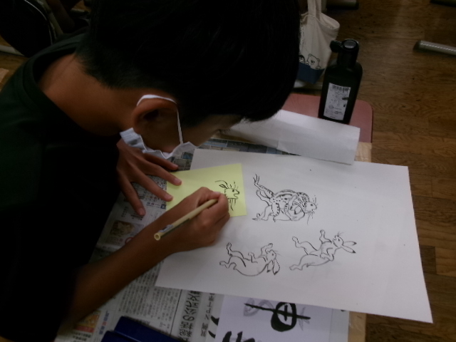 はじめは、漢字アートです。「雨」という漢字をやわらかい雨をイメージして描きました。次は「風」。春風や突風をイメージして作品にしました。また、干支の文字にも挑戦しました。「午うま」「未ひつじ」「申さる」等、ここでもおしゃべりすることなく作品に真剣に向かっていました。最後に、「動物」です。国語科の教科書に掲載されている「鳥獣戯画」を題材としました。