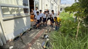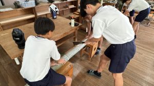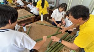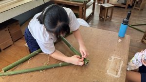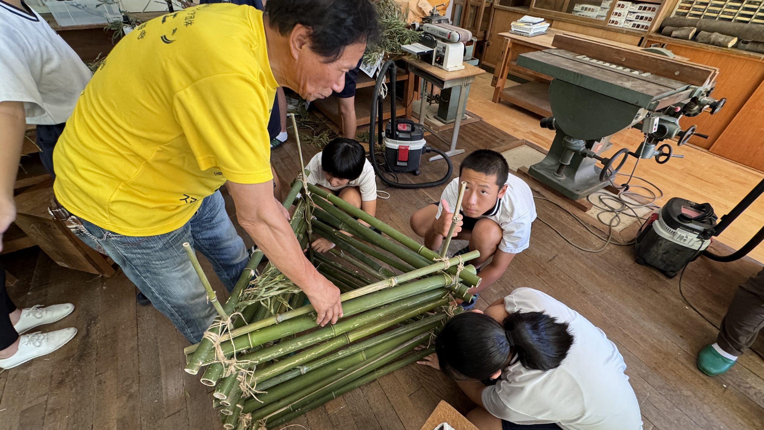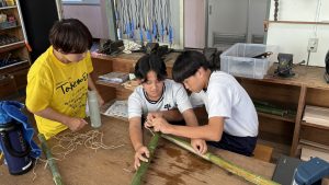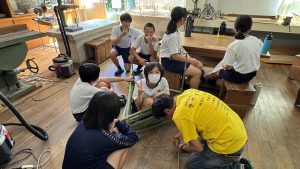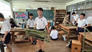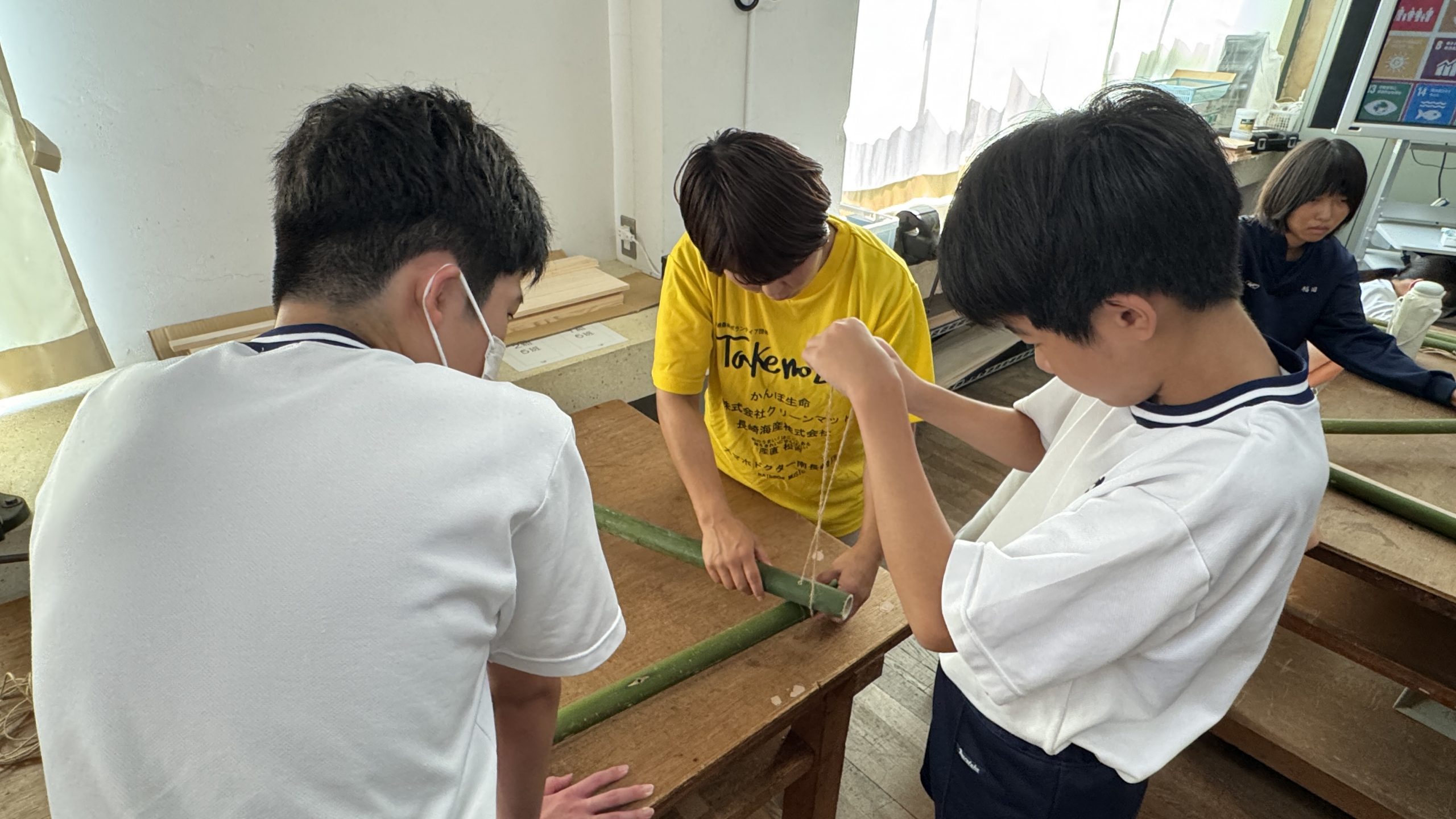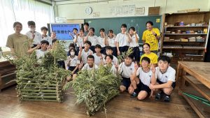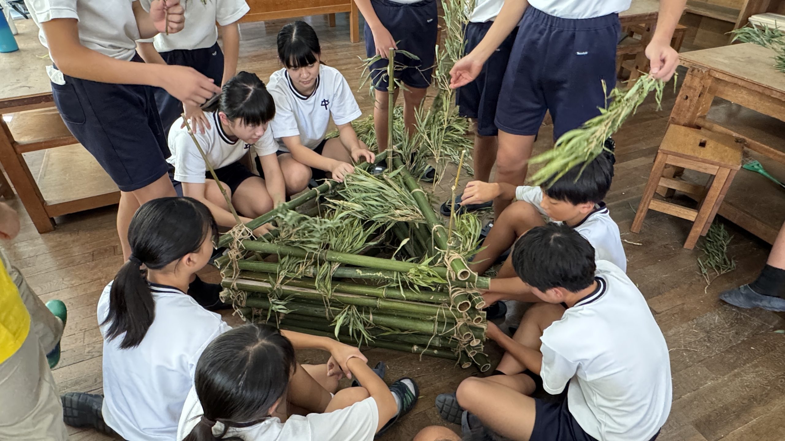 2年生のふるさと学では日見の山でとれた竹を使って魚礁作りを行いました。これを日見の海に沈め、魚の様子などを観察します。