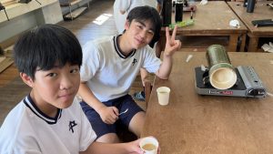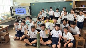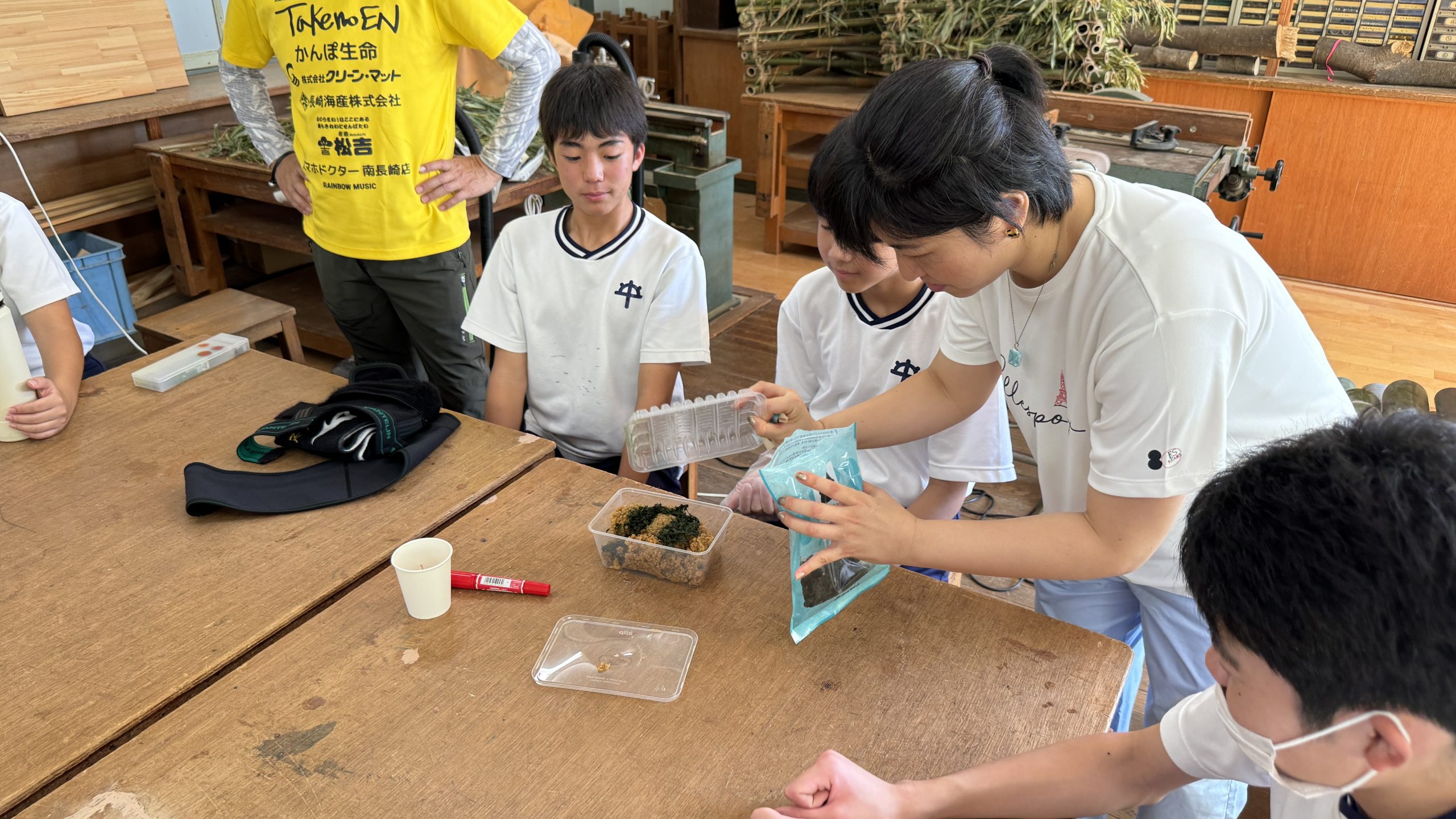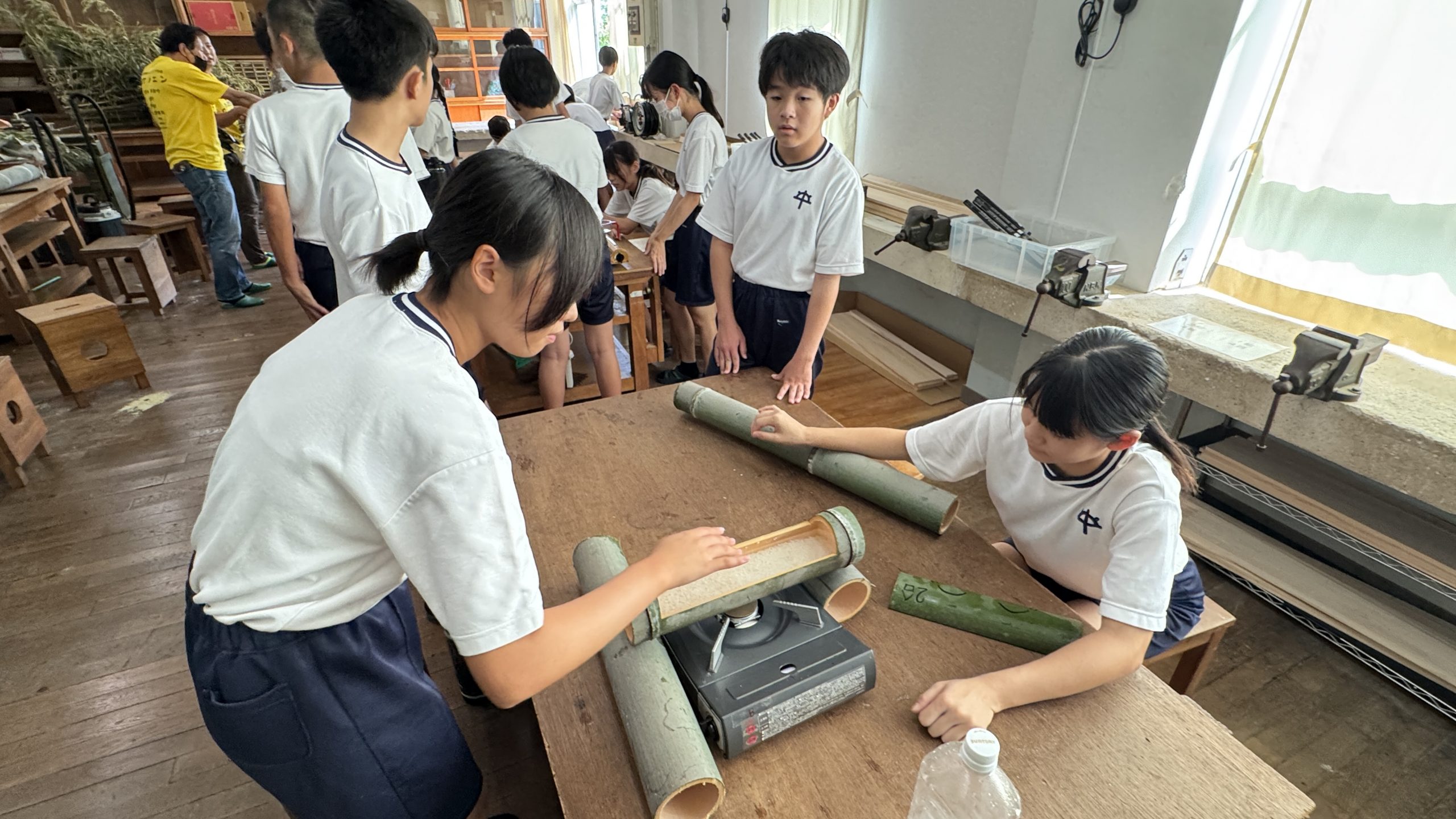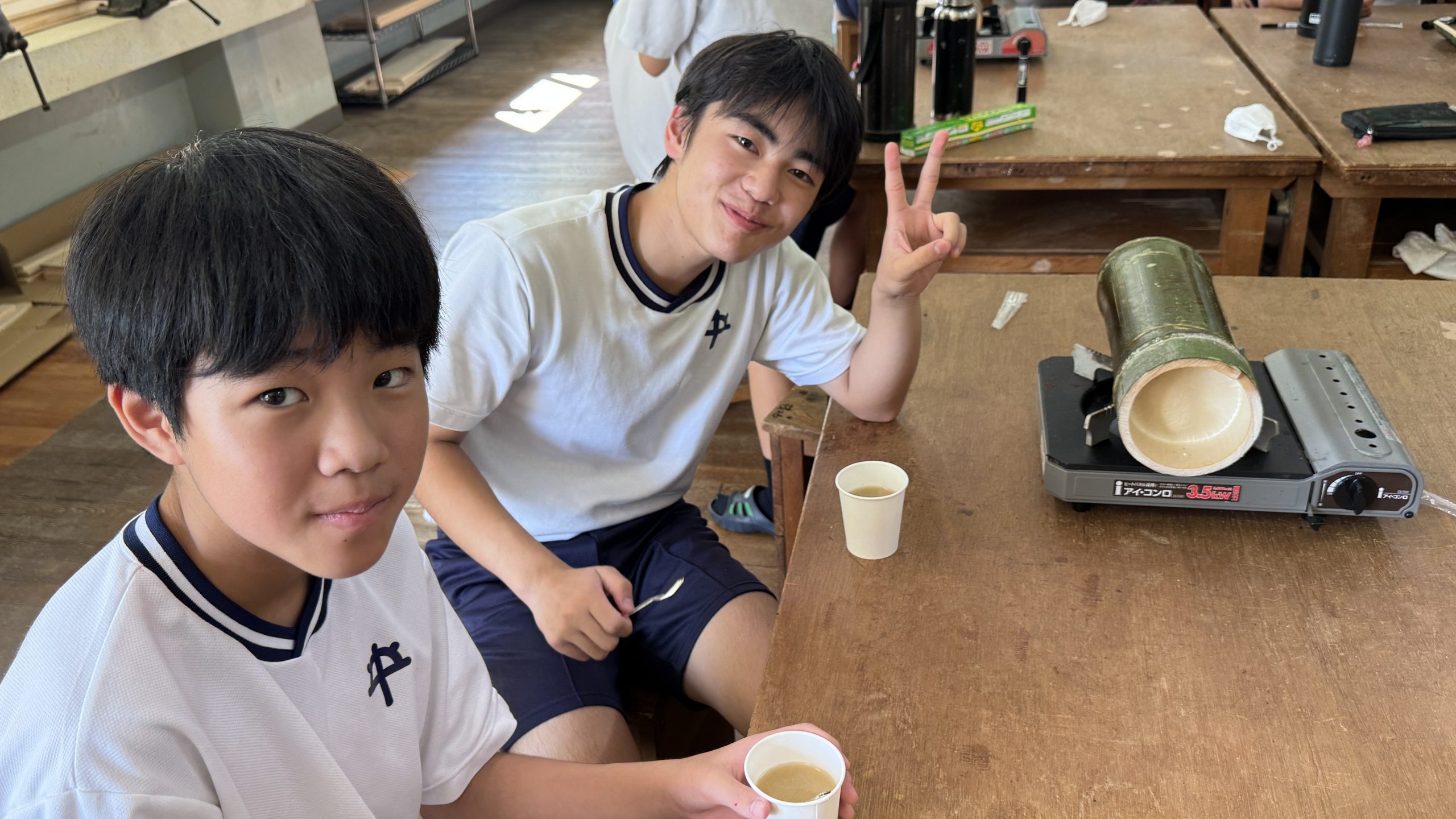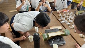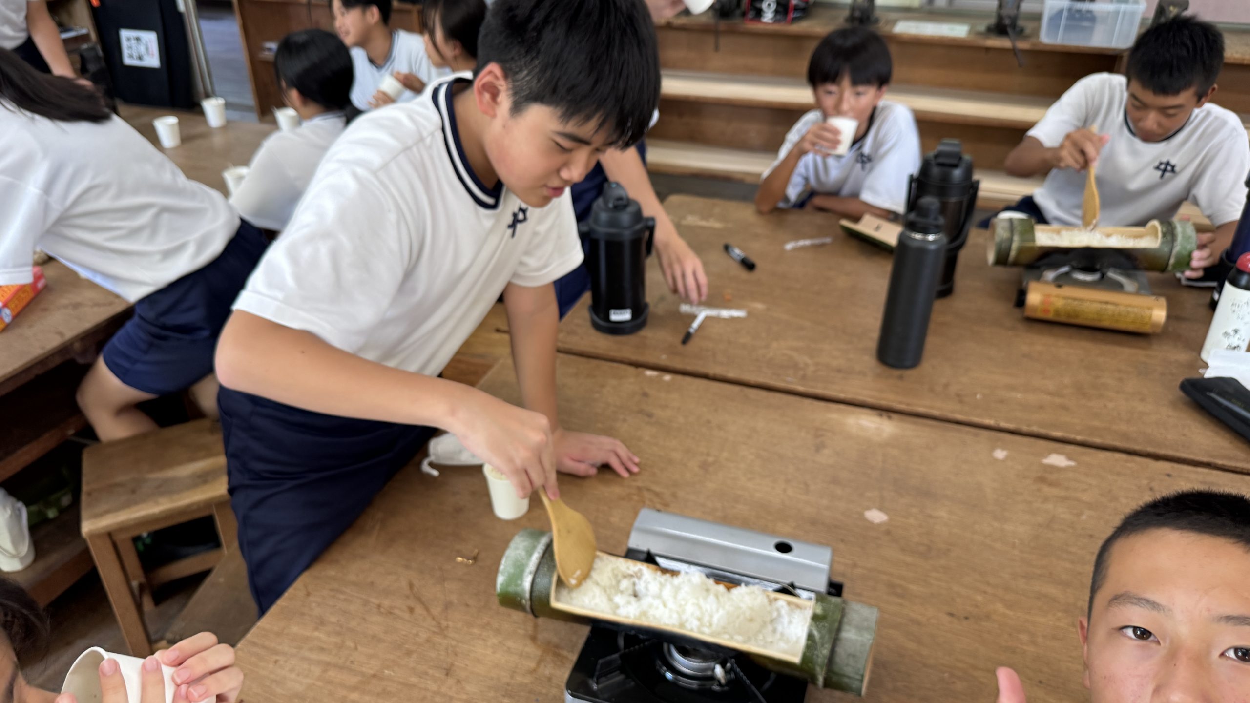 2年生のふるさと学では、防災の視点から芒塚の竹を使って飯盒炊爨をしました。保存食として味噌玉を作るなどの体験もできました。中嶋屋様からだしパックなどの協賛をいただきました、ありがとうございました。