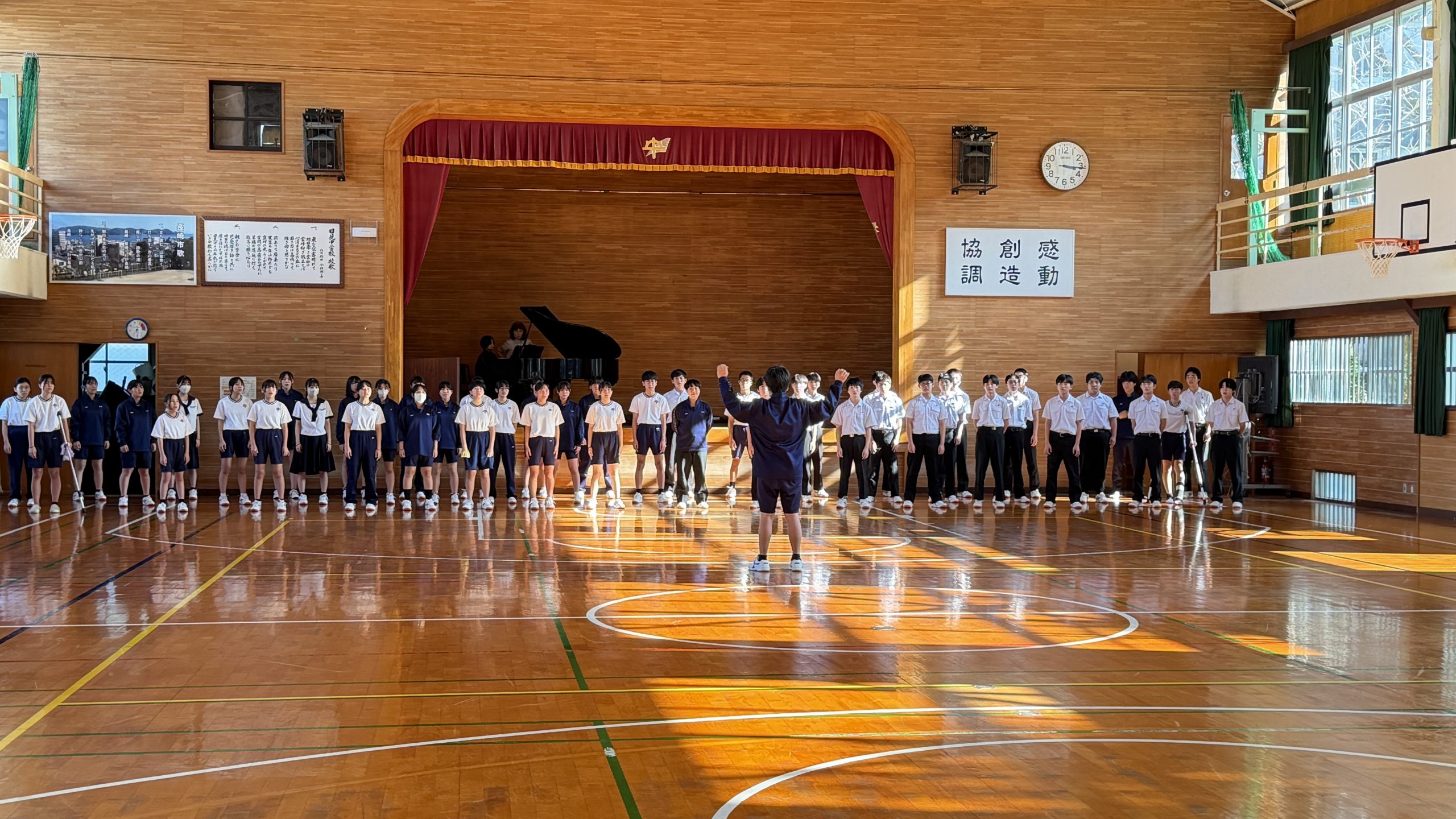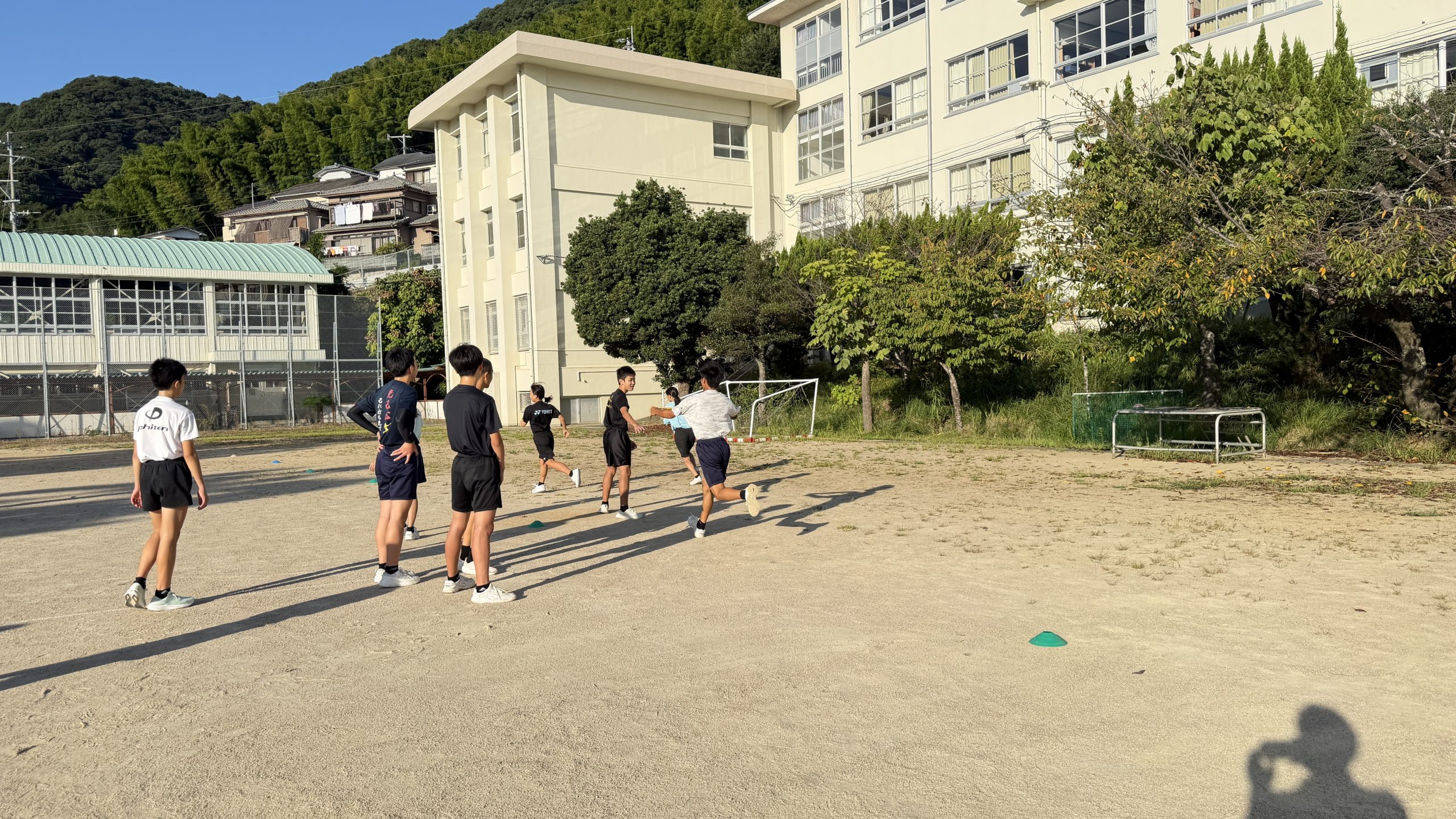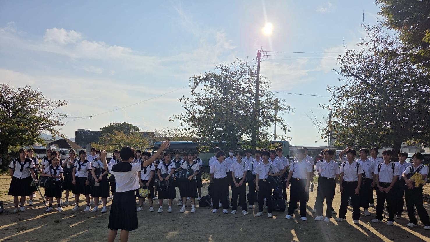 今日は快晴の下、”よっしゃ来い!”を練習しました。CDが止まるハプニングもありましたが、無音状態でも声を掛け合いながら動く場面も見られ、生徒たちが主体的に作り上げる様子を見ることができました。