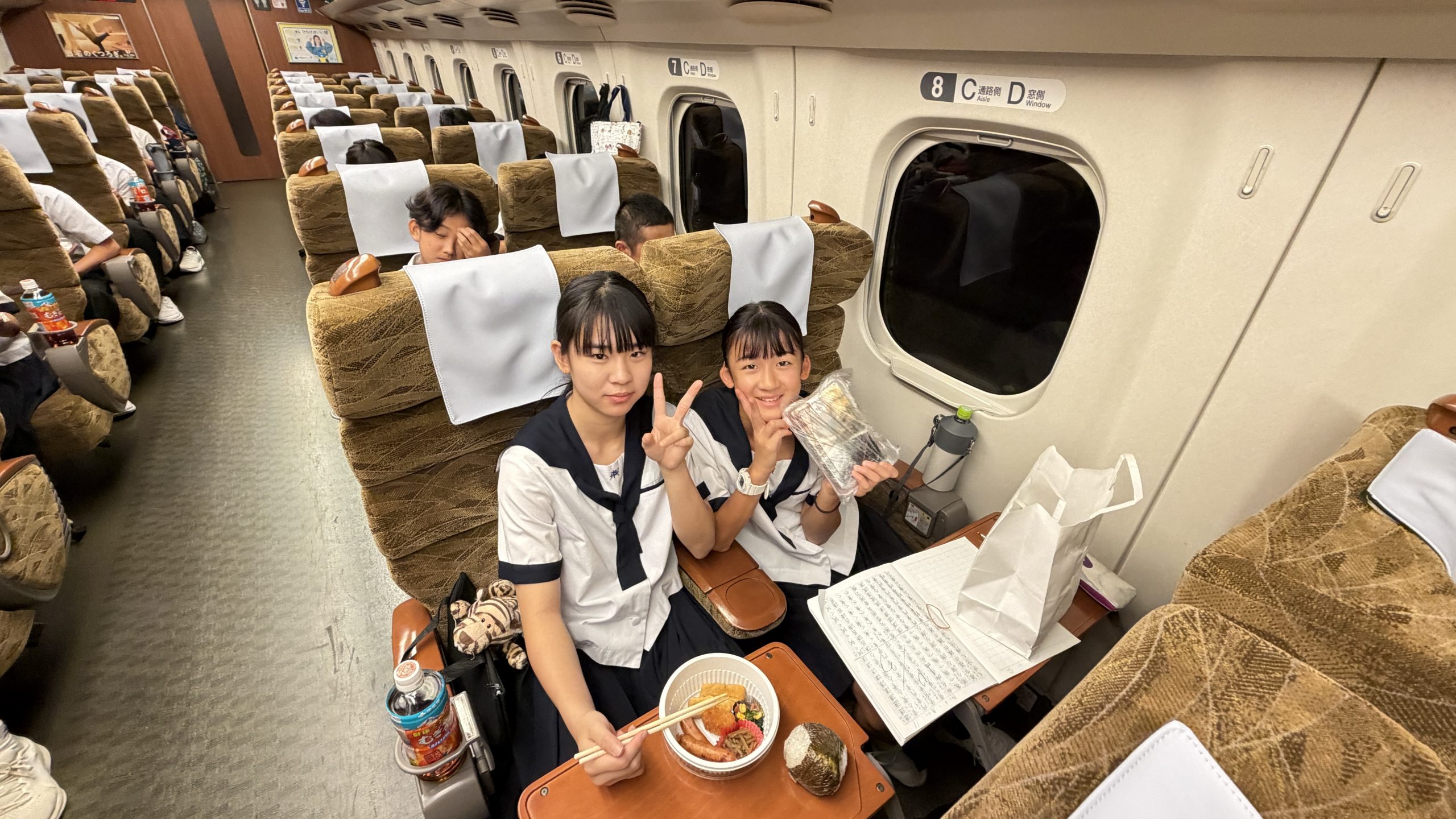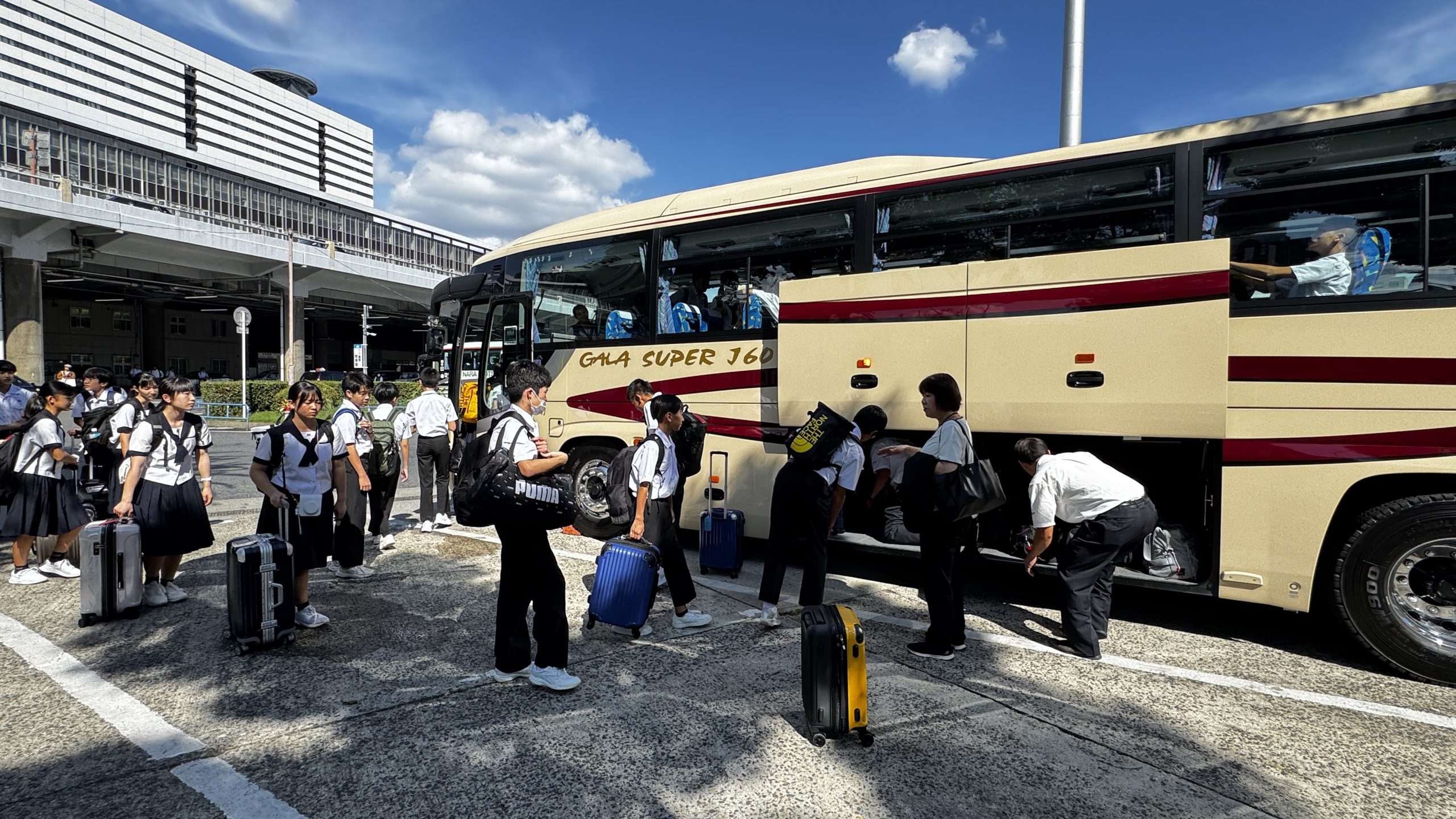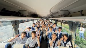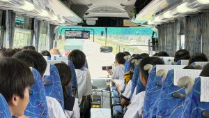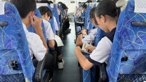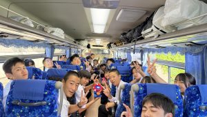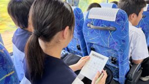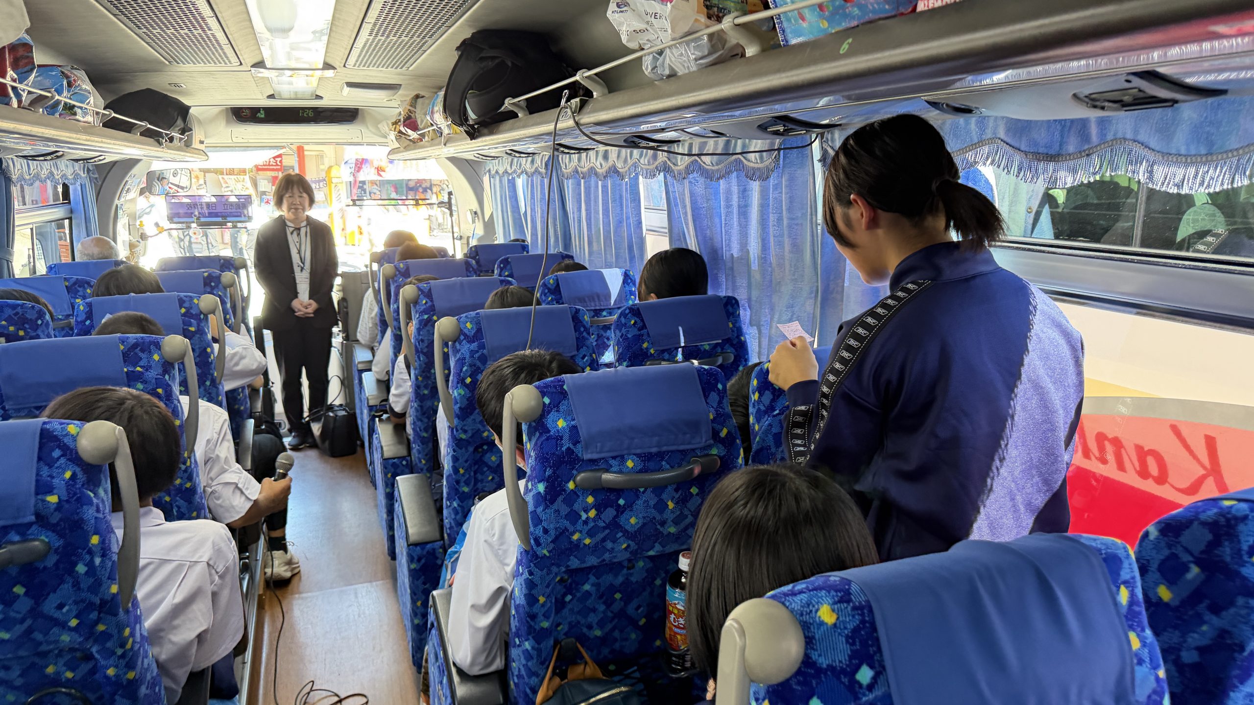 修学旅行出発!早速バスレクが始まりました。イントロクイズでみんなでいろんな曲を歌いました。