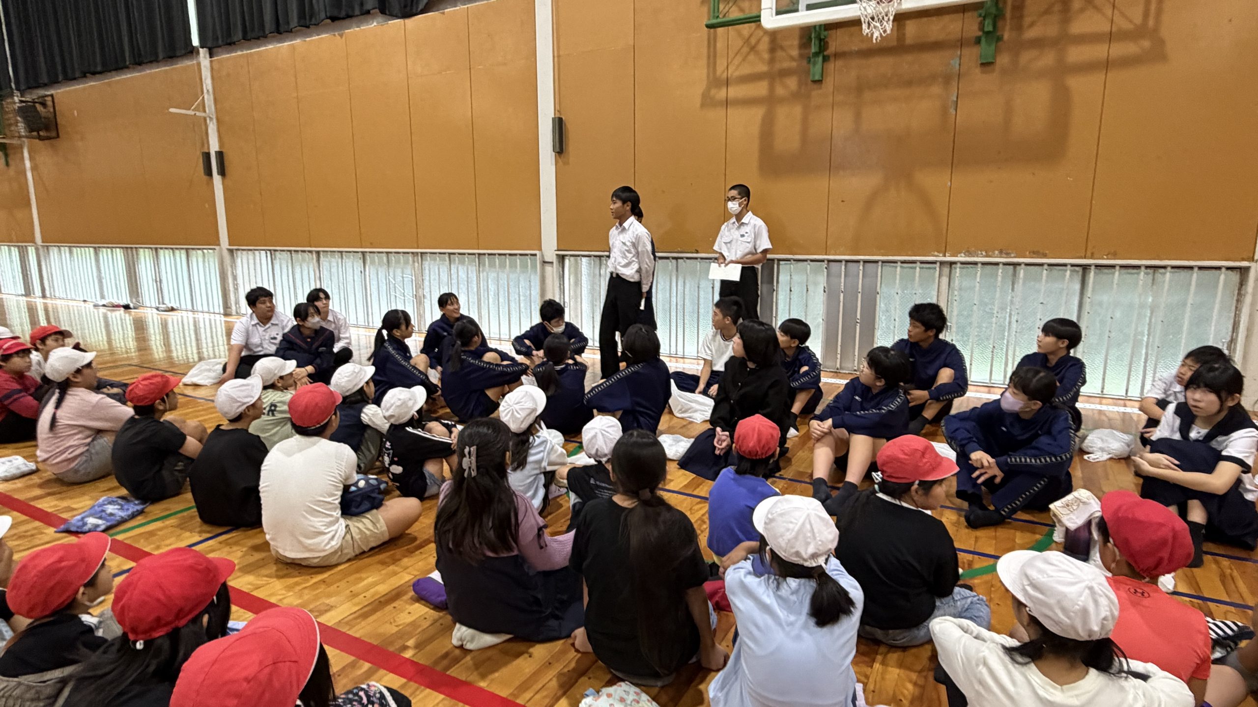 3、4時間目に小中合同の避難訓練が行われました。15mの津波を想定して総科大附属の体育館へ避難しました。