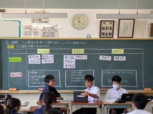 今週から先生たちの研修として”授業参観ウィーク”という取組が始まりました。3年社会では”決まりをつくる目的と方法”についての授業が公開されました。自分が考えた決まりの案を班で発表し合い、合意形成を図るという授業内容でした。