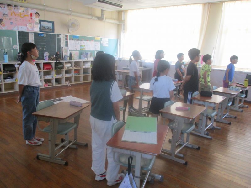 令和6年度(1学期)【学校生活】 平和を祈る会 【更新日】2024年08月09日 本日8月9日は登校日でした。全校で平和を祈る会をしました。第一部は全校で集まり「校長の話」を聞きました。第二部はオンラインで五年生の朗読発表などを聞く時間としました。そのようすをお知らせします。
