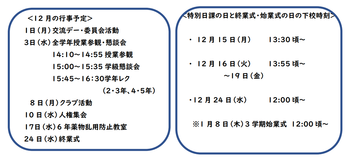 12月の行事予定と2学期末・3学期始の下校時刻