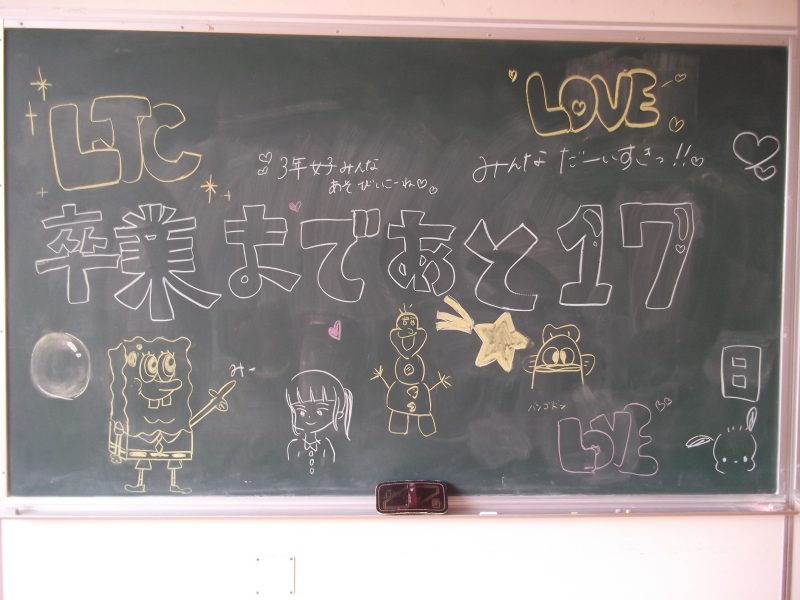 生徒たちが下校した後、3年生の空き教室の黒板に「思いでの落書き」が描かれていました。