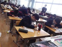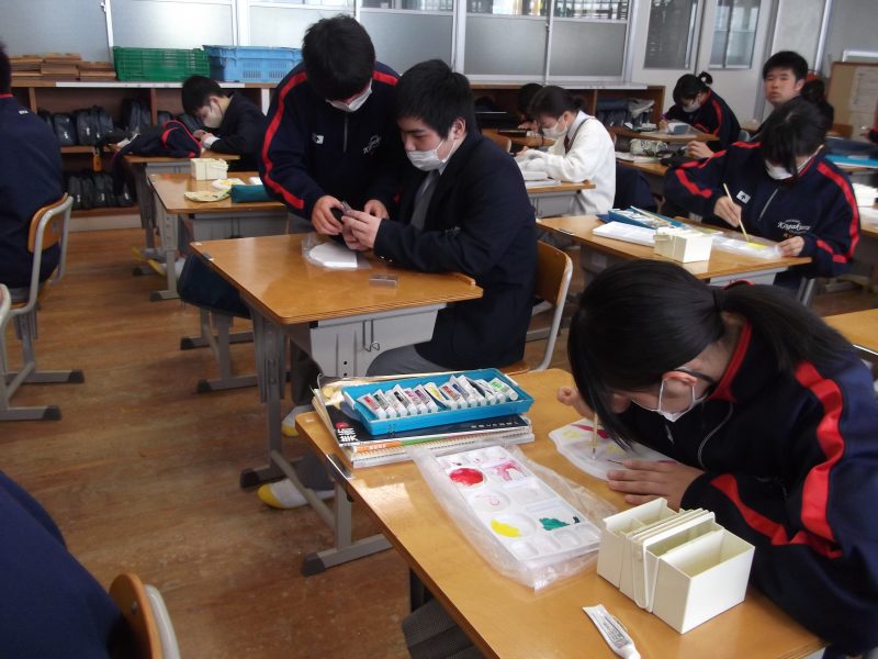 3月の授業風景 【更新日】2024年03月06日 1年生の美術では木材で工芸を行っています。 一人一つずつが「壁掛け」を製作しています。 材料の板に下絵を描き、彫刻刀で削り、紙やすりで磨き、 色をぬり、ニス仕上げをし、電動ドライバーでネジを付けたら完成です。 どんな作品ができるか楽しみですね。