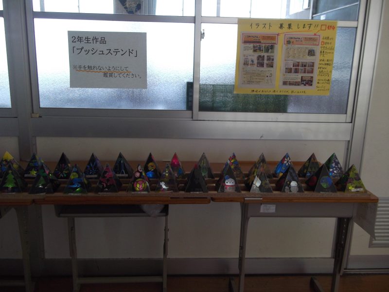 4階の展示2 【更新日】2025年03月02日 4階には美術作品を展示しています。 「プッシュステンドグラス」や「文字で伝えるデザイン」など1・2年生の力作です。 学校にお越しの際は、ぜひご覧ください。