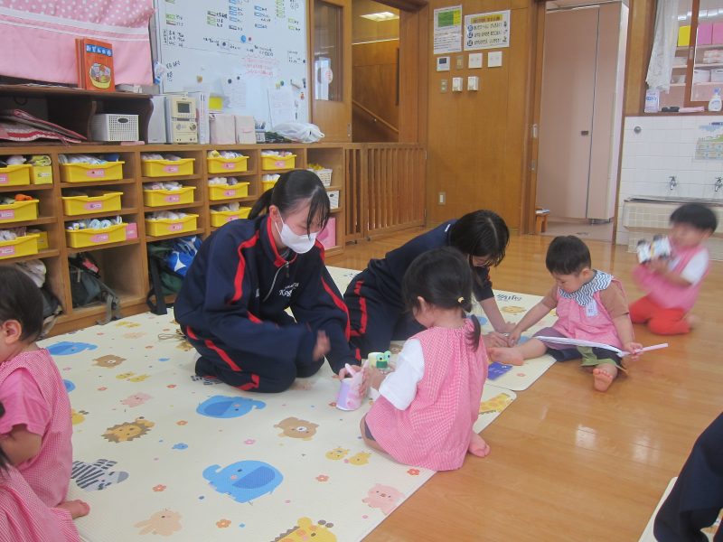 行事【学校生活】 保育実習2 【更新日】2024年10月26日 10月21日(月)に3年1組が、22日(火)に3年2組が、 ダイヤランド保育園で保育実習を行いました。 この日のために作成したおもちゃを使って遊んだり、 ボールを使って園児と触れ合ったりしながら、 保育の大切さを学ぶことができました。 *写真は3年2組です。