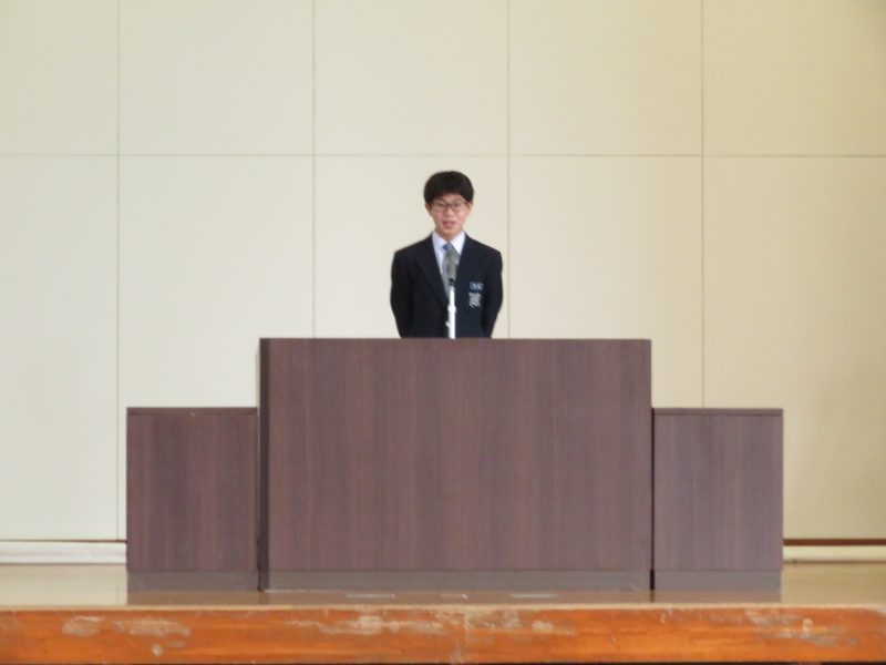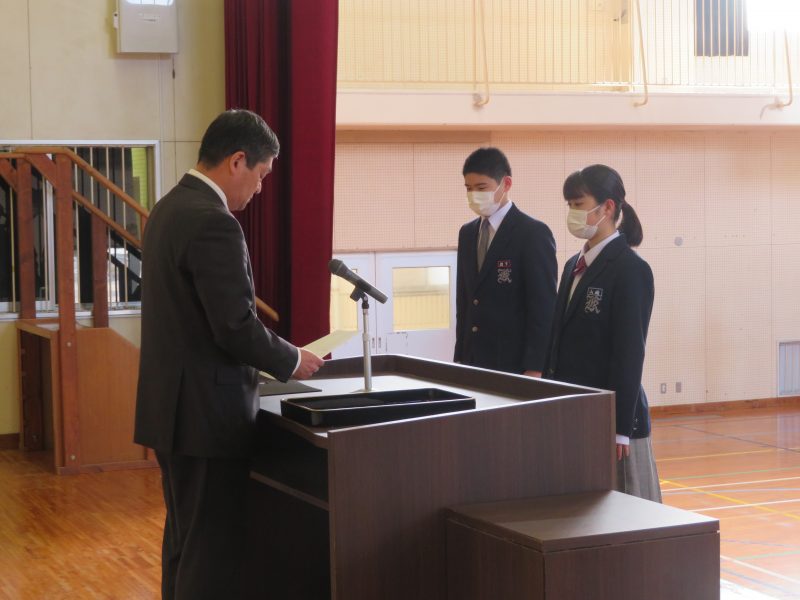 【】 修了式 【更新日】2023年03月27日 3月24日(金)修了式が行われました。 学年を代表して1年 山﨑 真帆さん、2年 岩下 悠生さんが修了証書をもらい、1年 中村 聡亮さん、2年 上野 凛さんが代表のあいさつを務めました。 4月から1学年進級します。春休みは飛躍するための準備期間となります。その準備期間を有効に使って、4月7日の始業式を迎えてください。
