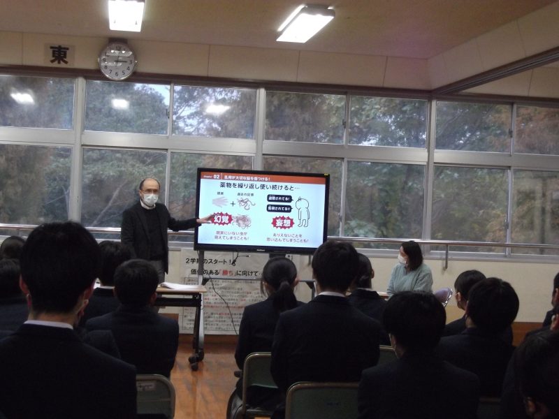 行事【学校生活】 薬物乱用防止教室 【更新日】2024年12月07日 12月5日(木)3年生を対象に薬物乱用防止教室「STOP the 薬物」が開かれました。 学校薬剤師の鍵本先生を講師にお迎えし、「大麻」や「覚せい剤」「危険ドラッグ」などの恐ろしさを学びました。 また、医薬品であっても正しく使わないと依存症になったり障害が残ったりすることも知りました。 「悩んだときは、まず相談」の大切さを実感した3年生たちでした。