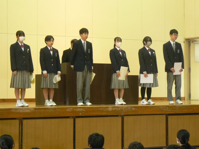 行事【学校生活】 表彰伝達式 【更新日】2024年12月25日 12月23日(月)表彰伝達式を行いました。 スポーツ面 卓球部女子:市新人戦優勝 ハンドボール部女子:郡市新人戦準優勝 空手道:県新人戦1年女子個人形優勝、組手3位 尾上選手 文化面 アイデアロボットコンテスト:県大会で第3位、九州大会準優勝 ロボ太郎チーム 中学生創造ものづくり教育フェア:特選 臼井さん、優秀賞 松永さん 県中学校総合文化祭では優秀作品賞:優秀作品賞 臼井さん、松永さん、川原さん、宮本さん 生徒たちのさらなる活躍を期待します。
