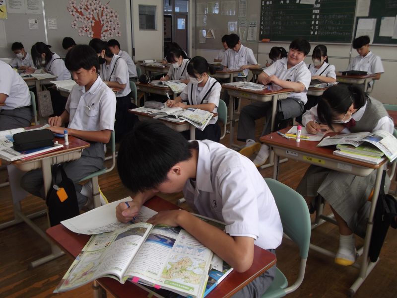 行事【学校生活】 10月の授業風景3 【更新日】2024年10月22日 2年1組は社会科の授業です。 近畿地方と中国・四国地方のレポートを作成しています。 切り貼りをしたり、色を付けたりしながら工夫しながらまとめています。
