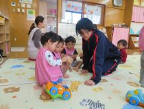 行事【学校生活】 10月20日 保育実習 【更新日】2023年10月20日 10月19日(木)3年1組がダイヤランド保育園で保育実習を行いました。 保育士の先生から説明を受けたあと、園児たちと楽しく楽しく遊びました。 その後、生徒から園児へ歌のプレゼントを行い、最後にお別れの会をしました。 短い時間でしたが、園児たちの無邪気な笑顔に力をもらった3年生たちでした。 (写真は保育園の許可をいただいて掲載しています。)
