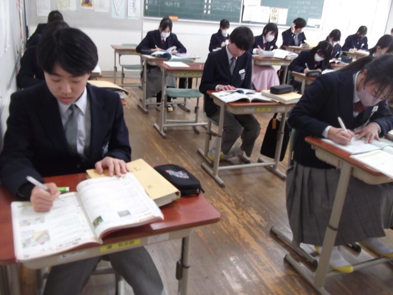 行事【学校生活】 2月の授業風景6 【更新日】2025年02月23日 2年生は英語の時間です。 この日は、学年末テスト直前でしたので、それぞれで学習の振り返りを行いました。 「過去進行形」や「不定詞の名詞的用法」など難しい問題にも真剣に取り組んでいました。