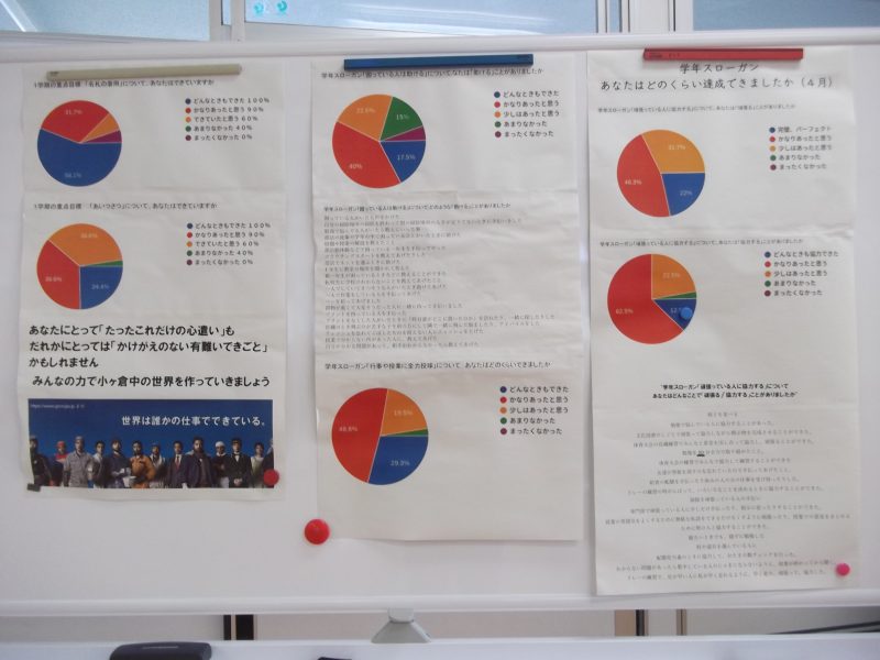 行事【学校生活】 6月の掲示物2 【更新日】2024年06月24日 3階の東側には2年生の教室があります。 また、教室の前に広いワークスペースがあるのが小ヶ倉中学校の特徴です。 ワークスペースには「学年スローガン」と「スローガン達成状況のグラフ」 教室には「自己紹介の桜の木」が掲示されていたのが印象的でした。