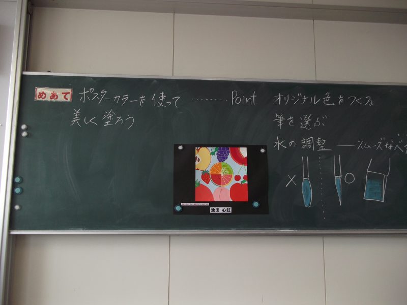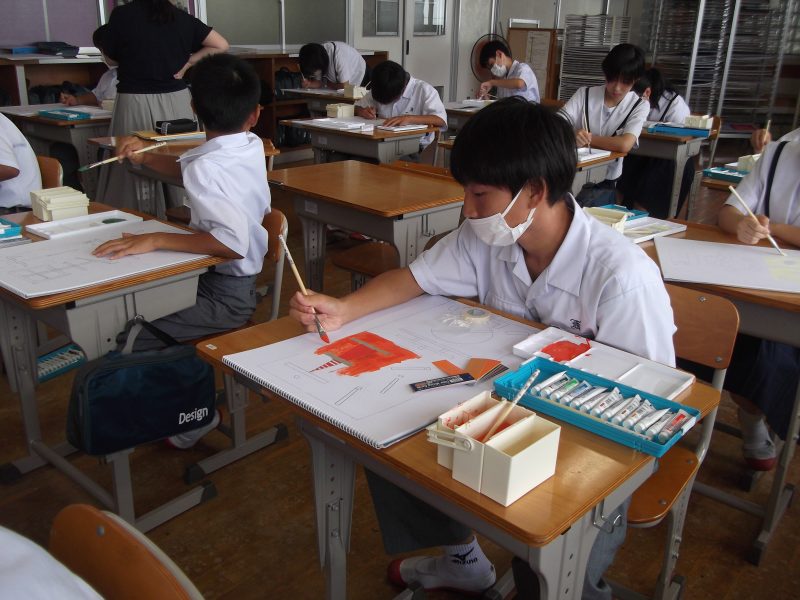 行事【学校生活】 7月の授業風景5 【更新日】2024年07月24日 この日は1年1組は美術の授業でした。 ポスターカラーを使ってデザイン画を制作しています。 先輩の絵を参考に、オリジナルの色をつくり、工夫しながら描いています。
