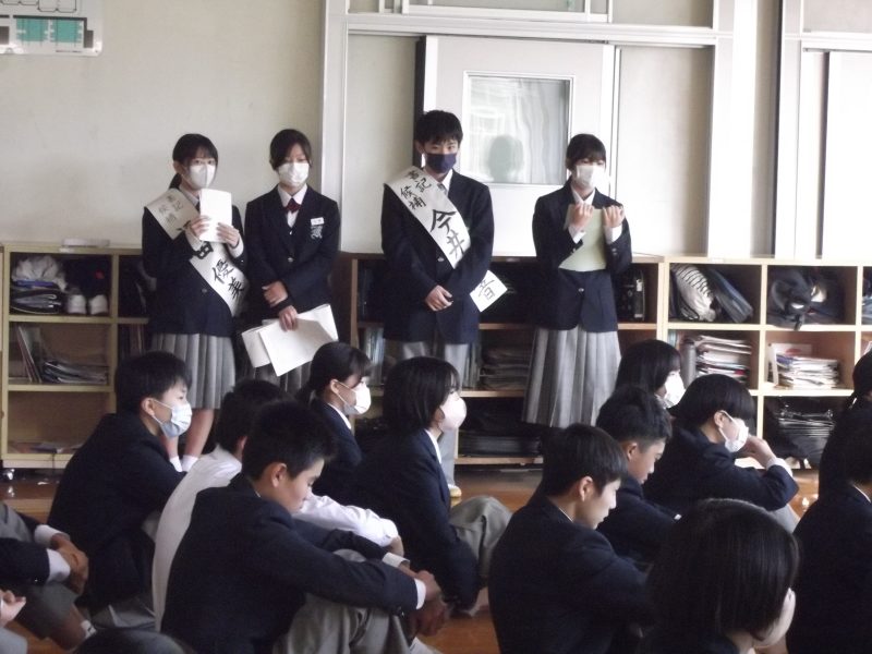 生徒会行事【生徒会活動】 生徒会選挙に向けて3 【更新日】2023年11月29日 12月1日(金)生徒会役員選挙が実施されます。 11月 7日(火)選挙のお知らせが掲示され、立候補者受付が始まりました。 11月14日(火)立候補者説明会があり、選挙告示が行われました。 11月24日(金)選挙運動期間に入りました。 *選挙ポスターを張ったり、朝から挨拶をして投票を呼び掛けています。 11月27日(月)昼休みに選挙演説放送が実施されました。 11月28日(火)朝からワークスペースでミニ選挙運動を行いました。