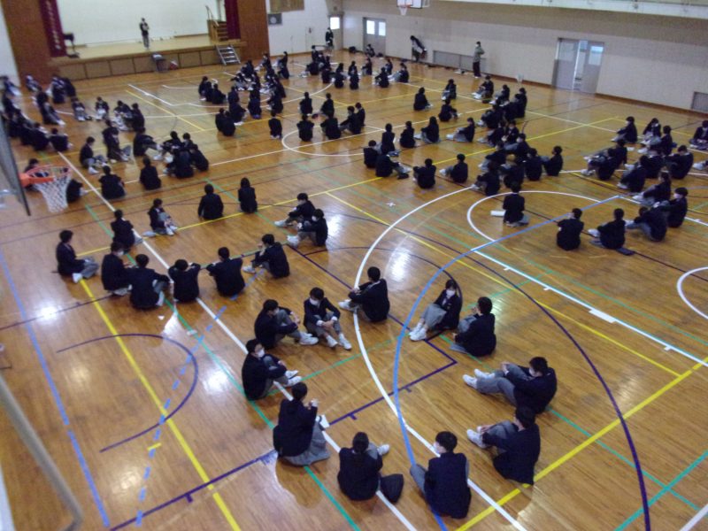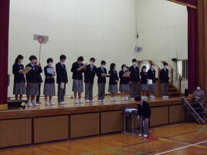 生徒会行事【生徒会活動】 3年生を送る会 【更新日】2023年03月14日 3月9日(木)に、生徒会主催で3年生を送る会が行われました。 和やかな雰囲気の中、これまでに授業などでお世話になった先生方からのメッセージの朗読やレクリエーション、3年間の振り返りのスライドショーの上映などが行われ、中学校最後の思い出づくりを全校生徒で行うことができました。