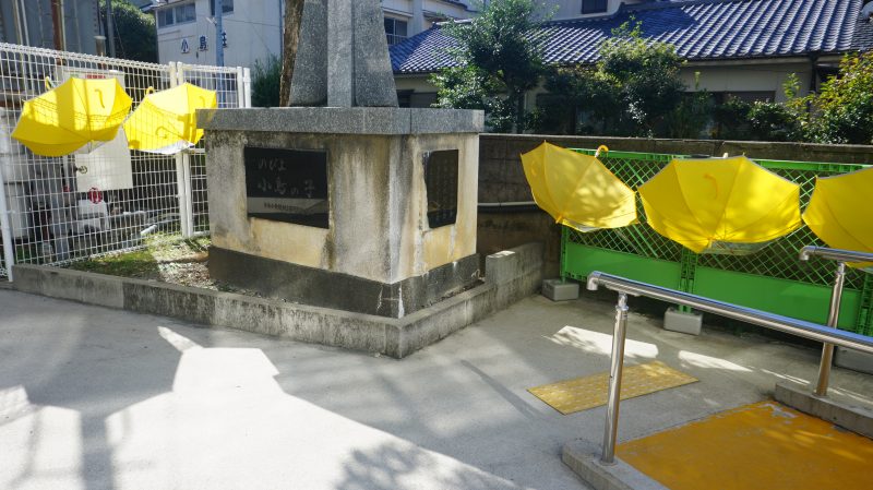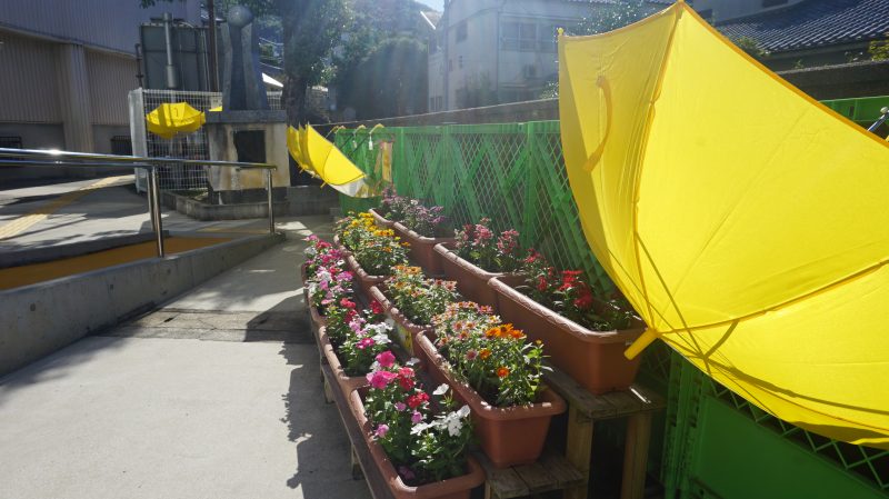 その後、しばらくすると、校舎の横を流れる清流小島川沿いの塀に、黄色い「傘の花」がいくつも咲いていました🌼
