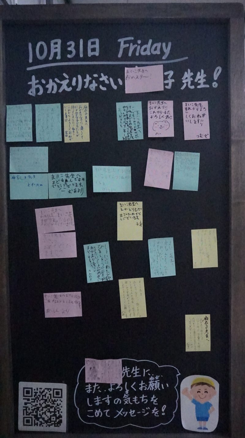 校長日記【学校生活】 (校長日記)本日のウェルカムボード♪ 【更新日】2025年10月31日 10月31日(金) 本日のメニューはこちら。 今日は遠足♪ ・・・のはずでしたが、昨日の予報に反して朝からしとしと秋の雨が落ちていました💧 残念。来週火曜日に延期です。 いいお天気となりますように・・・。byてるてる坊主 さて、今日は保健室担当の先生がバトンタッチする日で、保健室に先生が2人!という特別の日です。 これまで育児休暇だった先生とその代替で勤務していた先生。 子どもたちと職員にとっては、「おかえりなさい」と「ありがとうございました」が交錯する日です。 子どもたちは、それぞれに温かいメッセージを書いて、ボードがいっぱいになりました♡