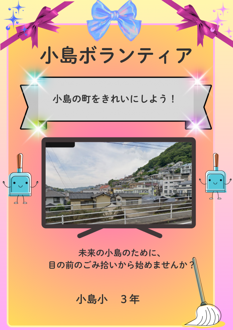校長日記【学校生活】 (校長日記)3年生「小島をよりよいまちにするために・・・」 【更新日】2025年03月10日 3月7日(金) 3年生は今年度、総合的な学習の時間の中で、地域にある「ふれあいセンター」を訪問したり、地域の魅力について調べたりする学習を行いました。 学習を通して、改めて地域のよさや魅力、課題に気付き、小島のまちをもっとよりよくしたいという思いを高めました。 今回は、その思いを具現化するために、それぞれの児童が考えたアイディアや願いをポスターに表現しました。 ポスターは、近々各自治会に配付し、掲示していただく予定です。 子どもたちの願いが届きますように…☆
