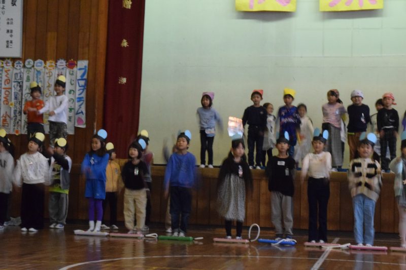 今回、国語科で学習した「おむすびころりん」を音読劇として披露しました。