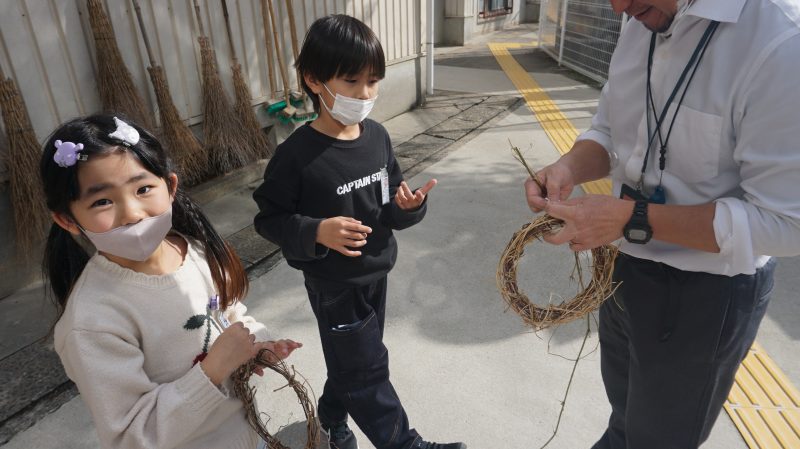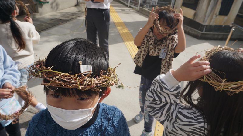 昨日の午前中、学校の玄関周辺で、生活科の学習で育てたアサガオの蔓を使ってXmasリースの土台を作りました。
