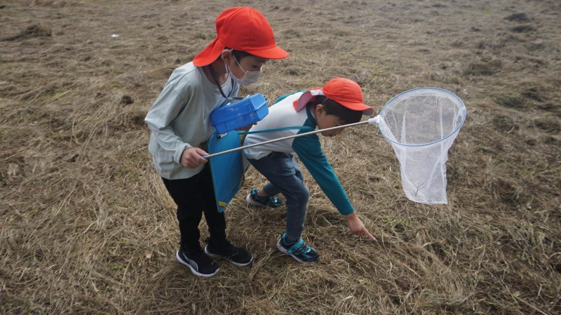 中には、手掴みで大きなトノサマバッタをゲットする強者もいます。一方、昆虫を見つけても自分では触れない子もいます。