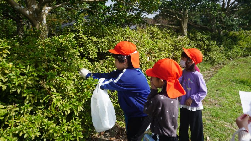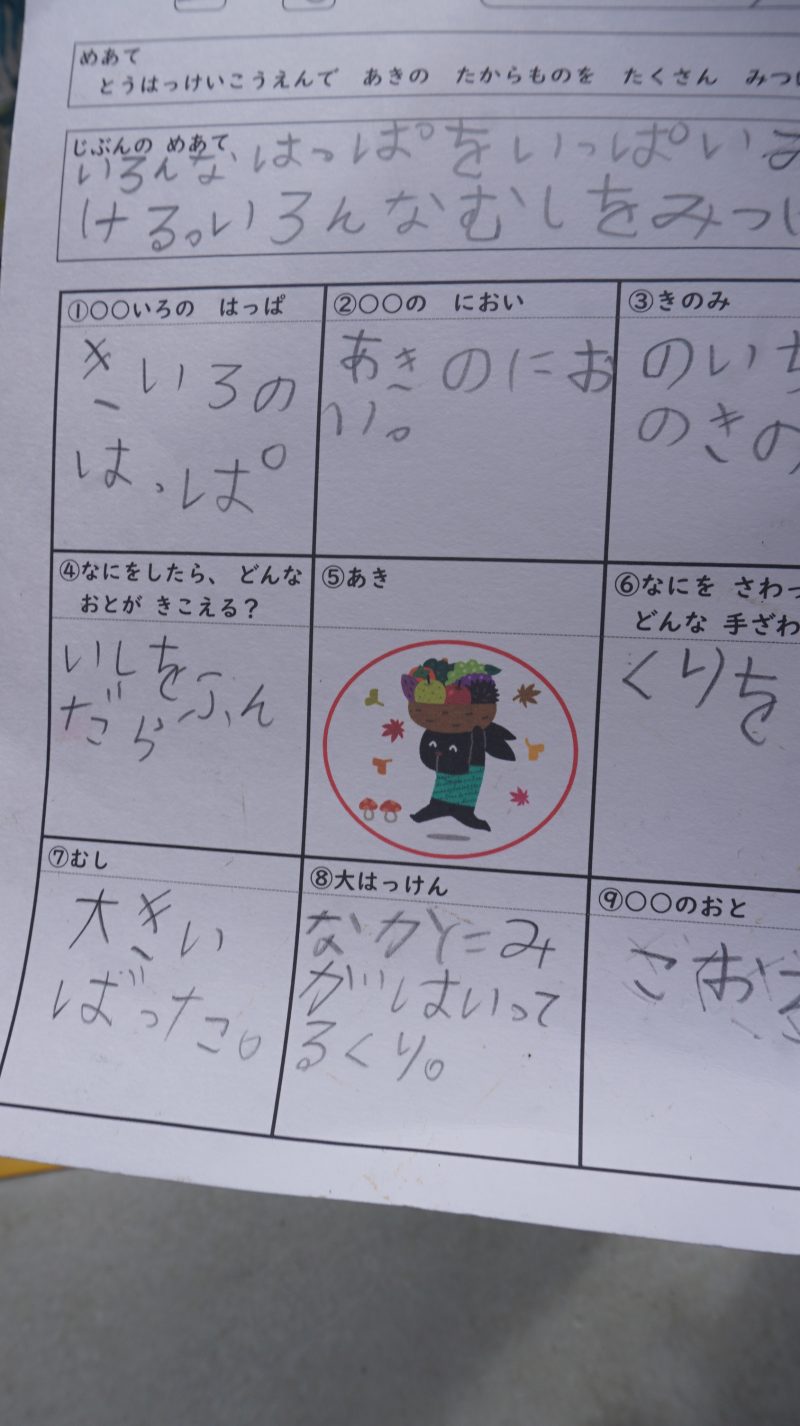 虫捕りの後は、秋の宝物を見付けて記録する「ビンゴカード」に取り組みました。子どもたちは五感を働かせて、たくさんの秋を発見することができました。