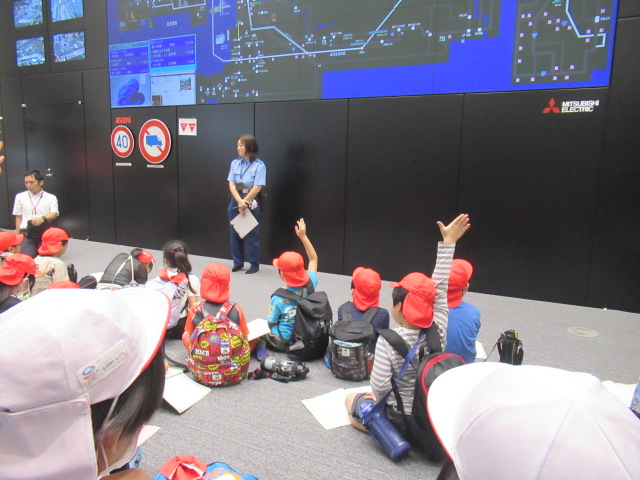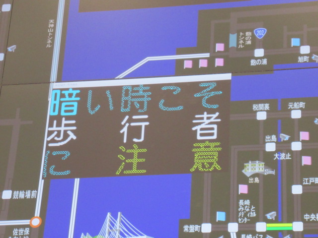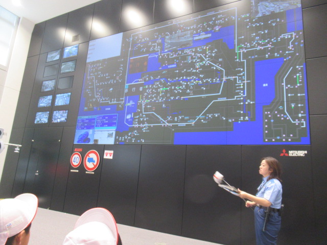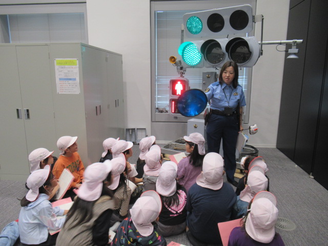次に、交通管制センターを見学しました。県内の主要道路の渋滞状況や交通情報が一目で分かる画面に驚かされました。また、実際の信号機の大きさや管理の仕方など詳しく教えていただきました。